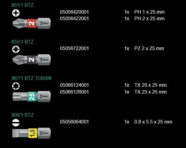 - Компоненты содержали : 1 x ph 1 x 25 мм; 1 x ph 2 x 25 мм; 1 x pz 2 x 25 мм; 1 X TX 20 x 25 мм; 1 X TX 25 x 25 мм, 1x 0,8x5,5x25 мм