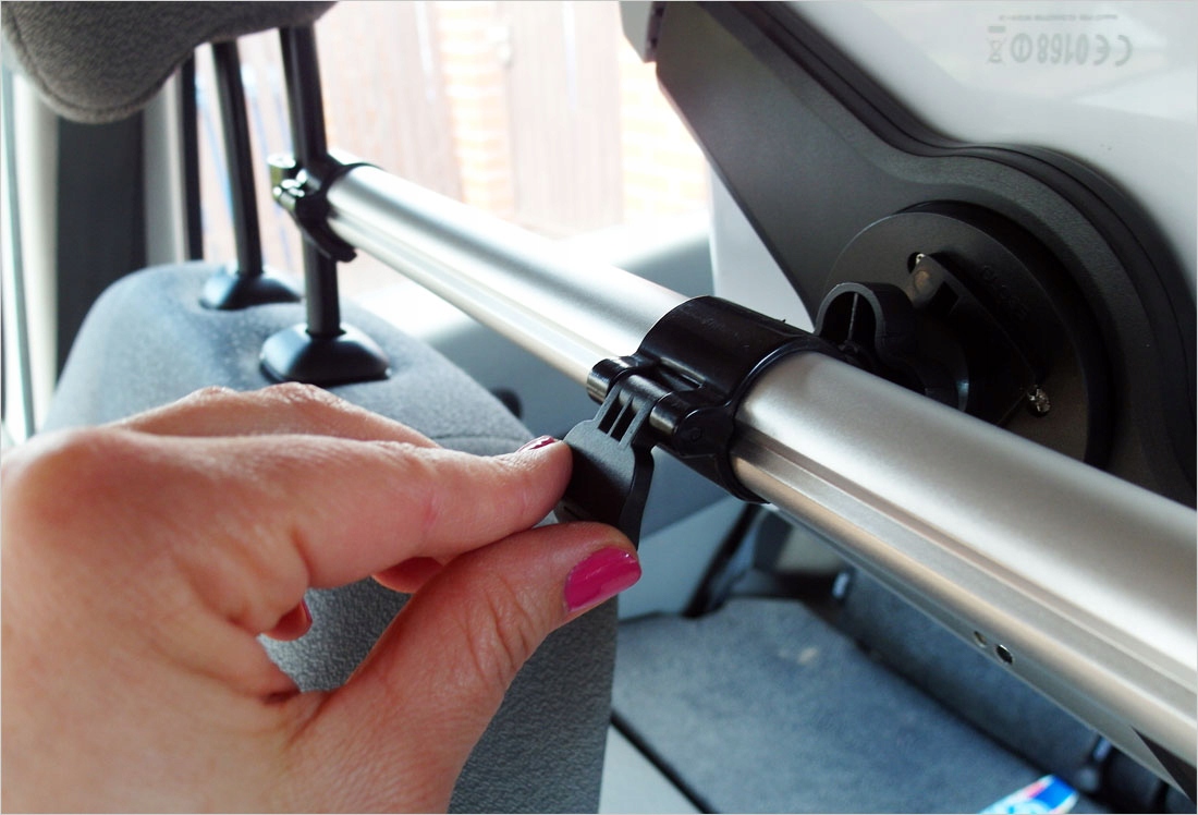 Ручка подголовок очень проста. Вы распространяете зажимы, чтобы исправить ручку до ширины подголовников в вашем автомобиле (на сиденье водителя и пассажира), а затем блокируете их. И вот и все - ручка содержит подголовник сиденья (и, точнее,: подголовные трубки - см. Фото).