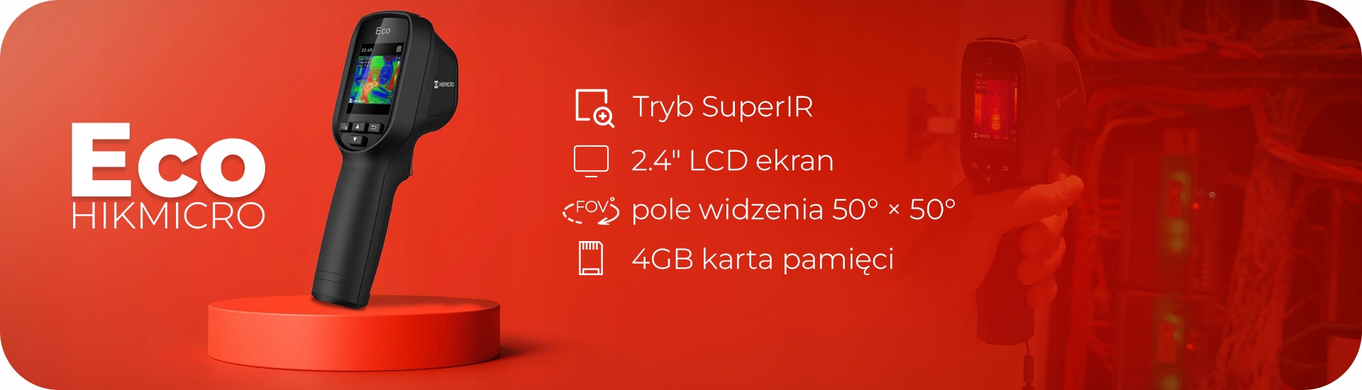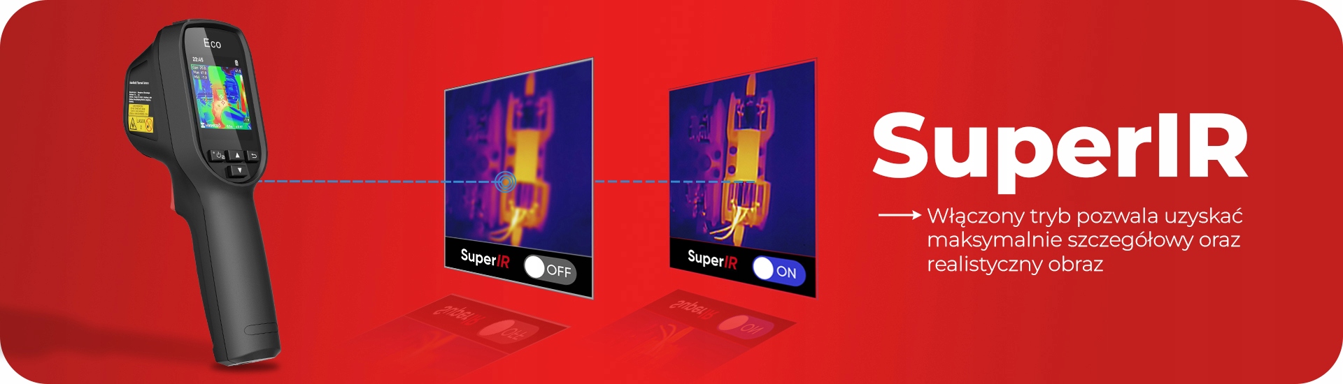 В случае эквивалента модель Eco-V дополнительно оснащена режимами Fushion и Визуально и более низкие температуры объекта из -за окраски. Чем выше температура, тем темнее тон. Эти цвета соответствуют различным диапазонам температуры, что позволяет операторам тепловизионной визуализации легко различать области с различными температурами на изображении. Например, красный цвет может представлять области с более высокими температурами, в то время как синий означает более низкие температуры. Чем выше температура, тем ярче тонал. Тревога - изображение показывает объекты вышеуказанной температуры в оттенках красного, при этом выбирая слишком высокую температуру наблюдаемого объекта