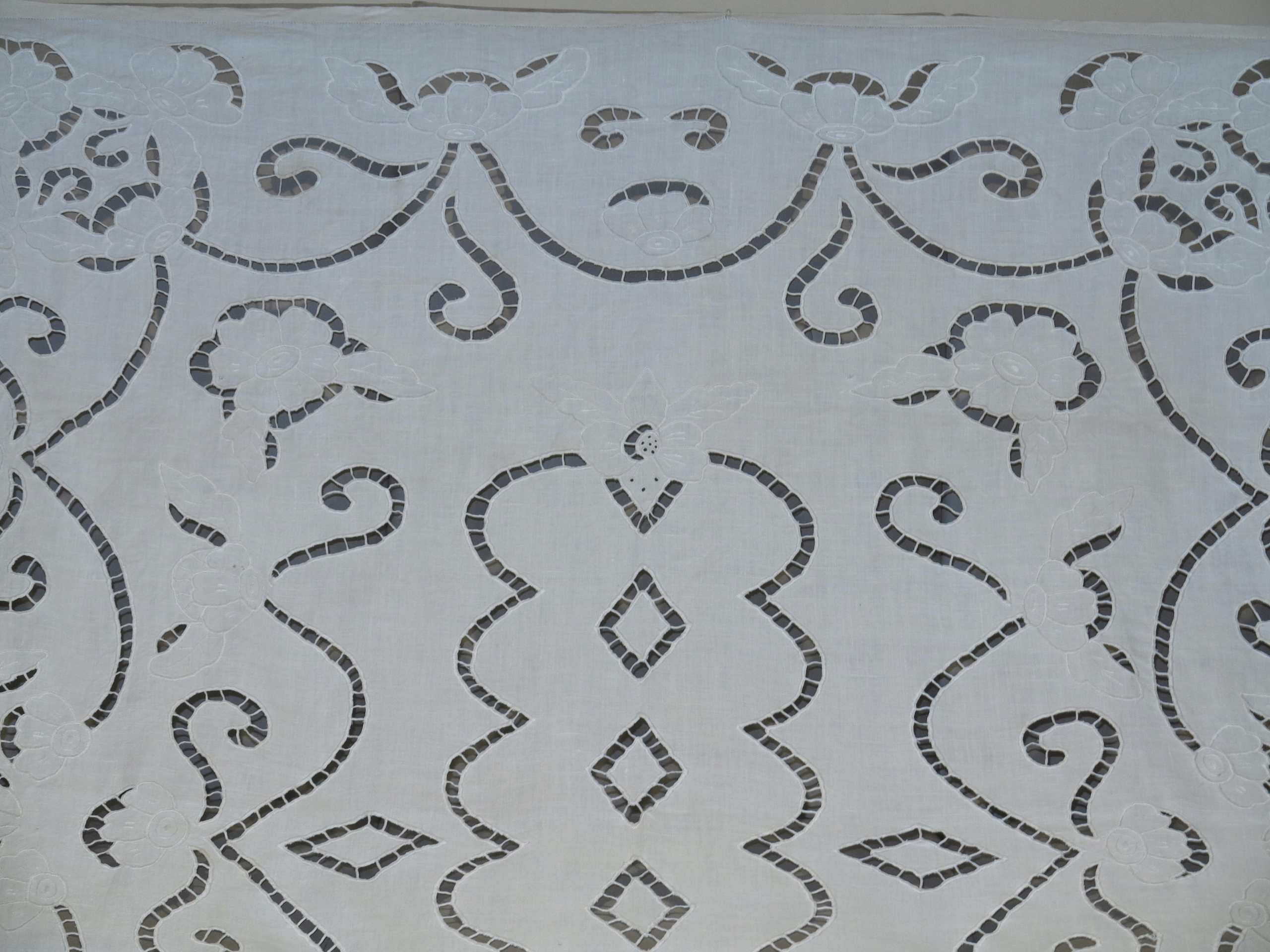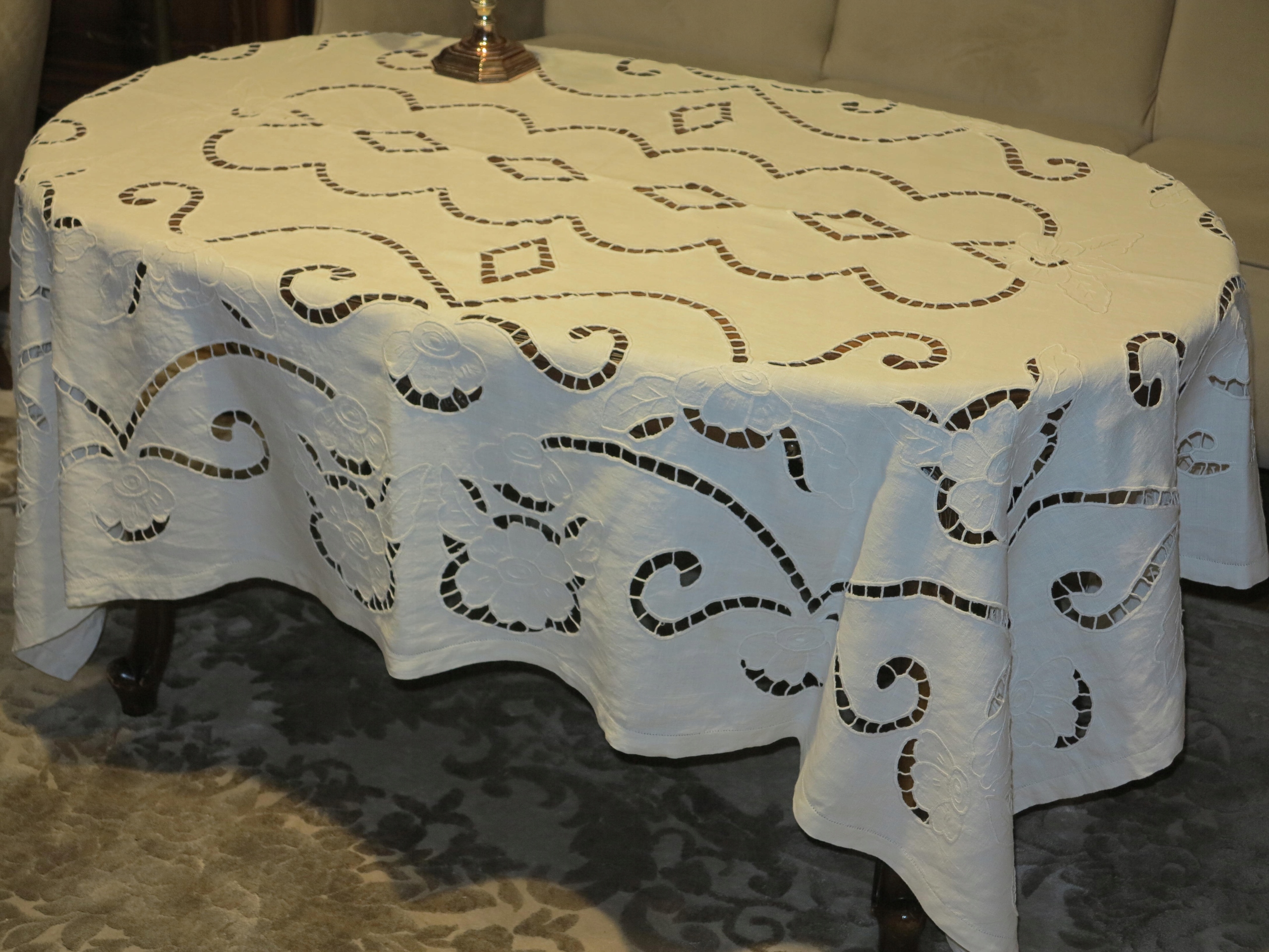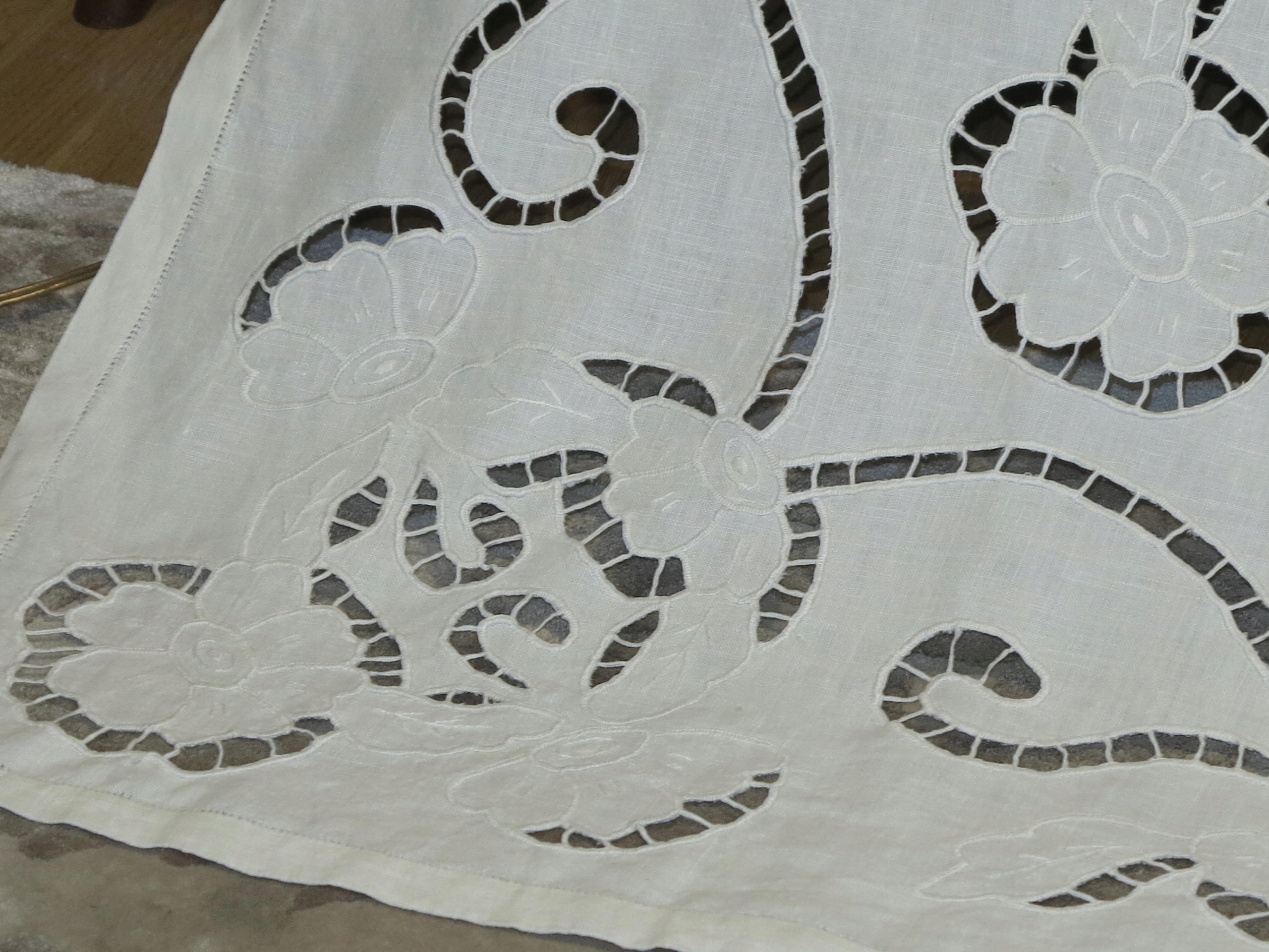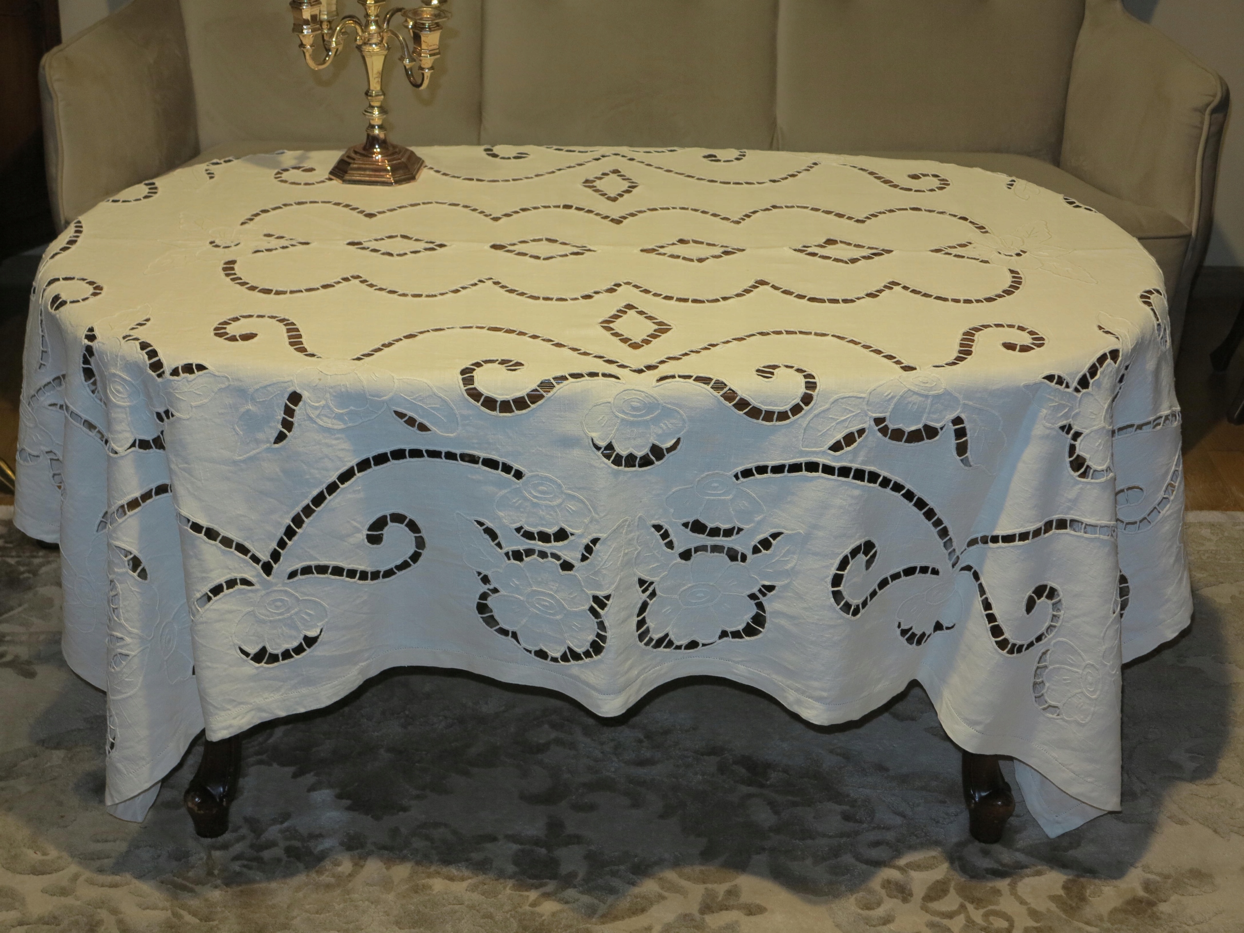 ОЧЕНЬ КРАСИВАЯ СКАТЕРТЬ ИЗ ЧИСТОГО ЛЬНА, ПОЛНОСТЬЮ РУЧНОЙ РАБОТЫ, С БОГАТОЙ РИШЕЛЬЕ ВЫШИВКОЙ И АЖУРОМ. ВОКРУГ ДВОЙНАЯ ПОЛОСКА, УКРАШЕННАЯ МАЛЕНЬКОЙ КАМЕРКОЙ. ЦВЕТ: БЕЛЫЙ КРЕМОВЫЙ/СВЕТЛО-ЭКРУ