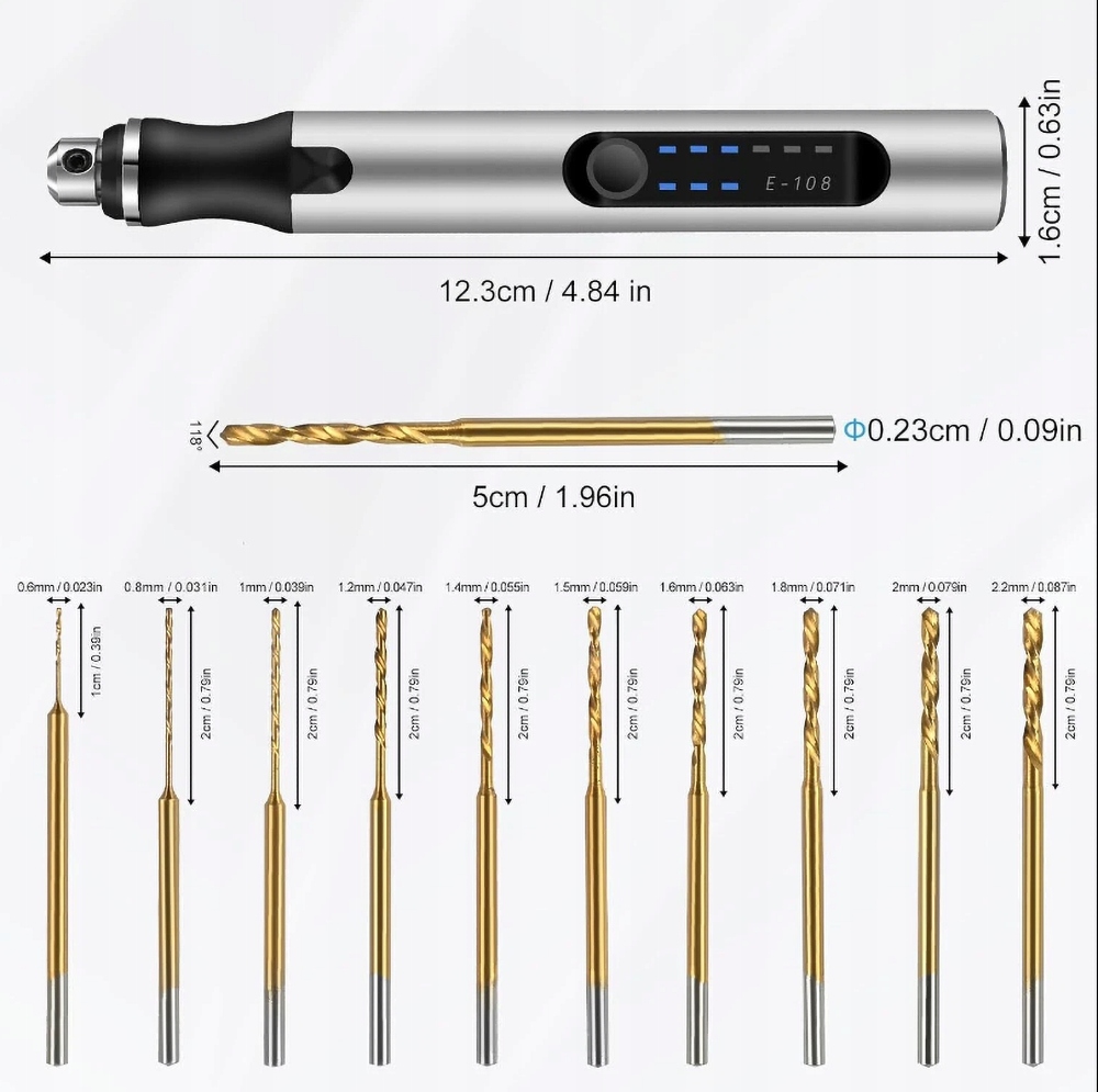 - набор включает в себя 10 буровых работ различных диаметров (0,6, 0,8, 1,0, 1,2, 1,4, 1,5, 1,6, 1,8, 2,0 и 2,2 мм), изготовленных из высококачественной стали высокой скорости (HSS), что является чрезвычайно твердым и долговечным.