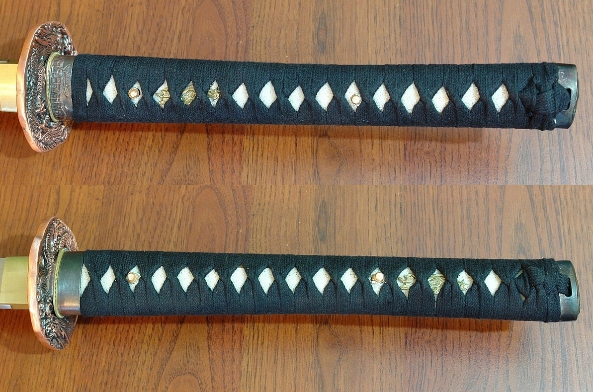 - ручка (цука) деревянная, покрытая натуральными кожаными лучами (Sam-gawa), черная хлопковая оплетка, тяжело вытянутая. порезы.