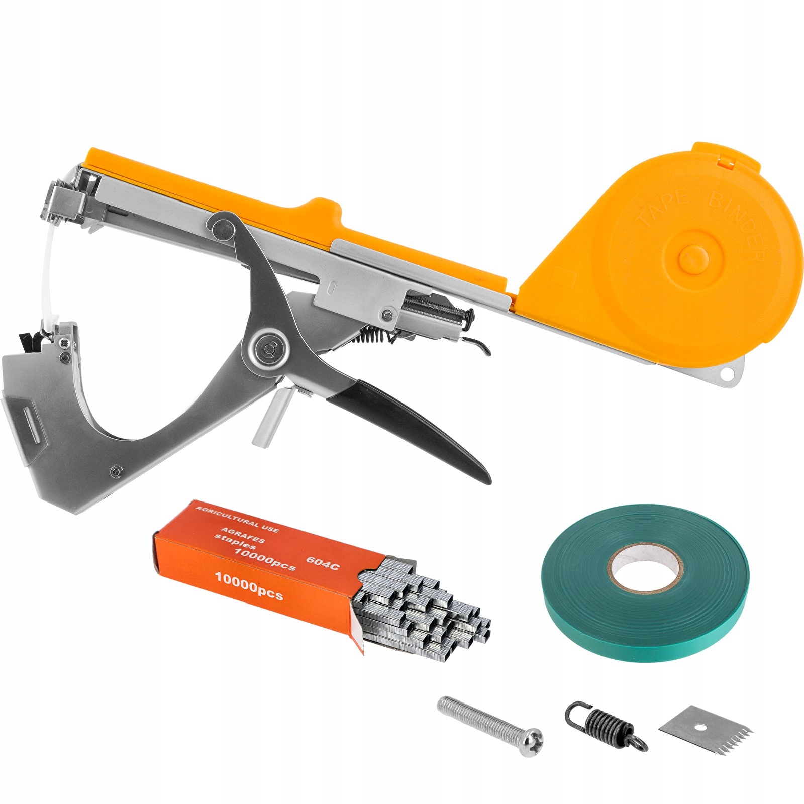 Предлагаемый садовый степлер представляет собой полную комплектацию, включающую необходимую ПВХ-ленту длиной 30 м, набор из 10 000 скоб и запасные части: лезвие и пружину. После использования вы можете купить скотч и скобы в нашем магазине.