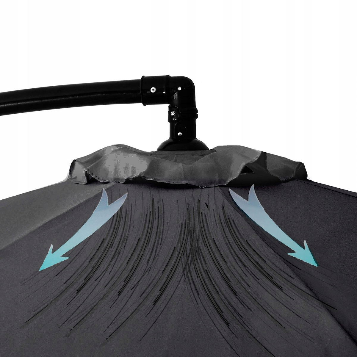 Нахождение под прикрытием от солнца — зонтиком или парусом — может быть связано с дополнительным обогревом и отсутствием циркуляции в безветренные дни. Наш зонт оснащен вентиляционным отверстием в верхней части купола, что обязательно повысит комфорт использования, особенно если под зонтиком играют самые маленькие дети.