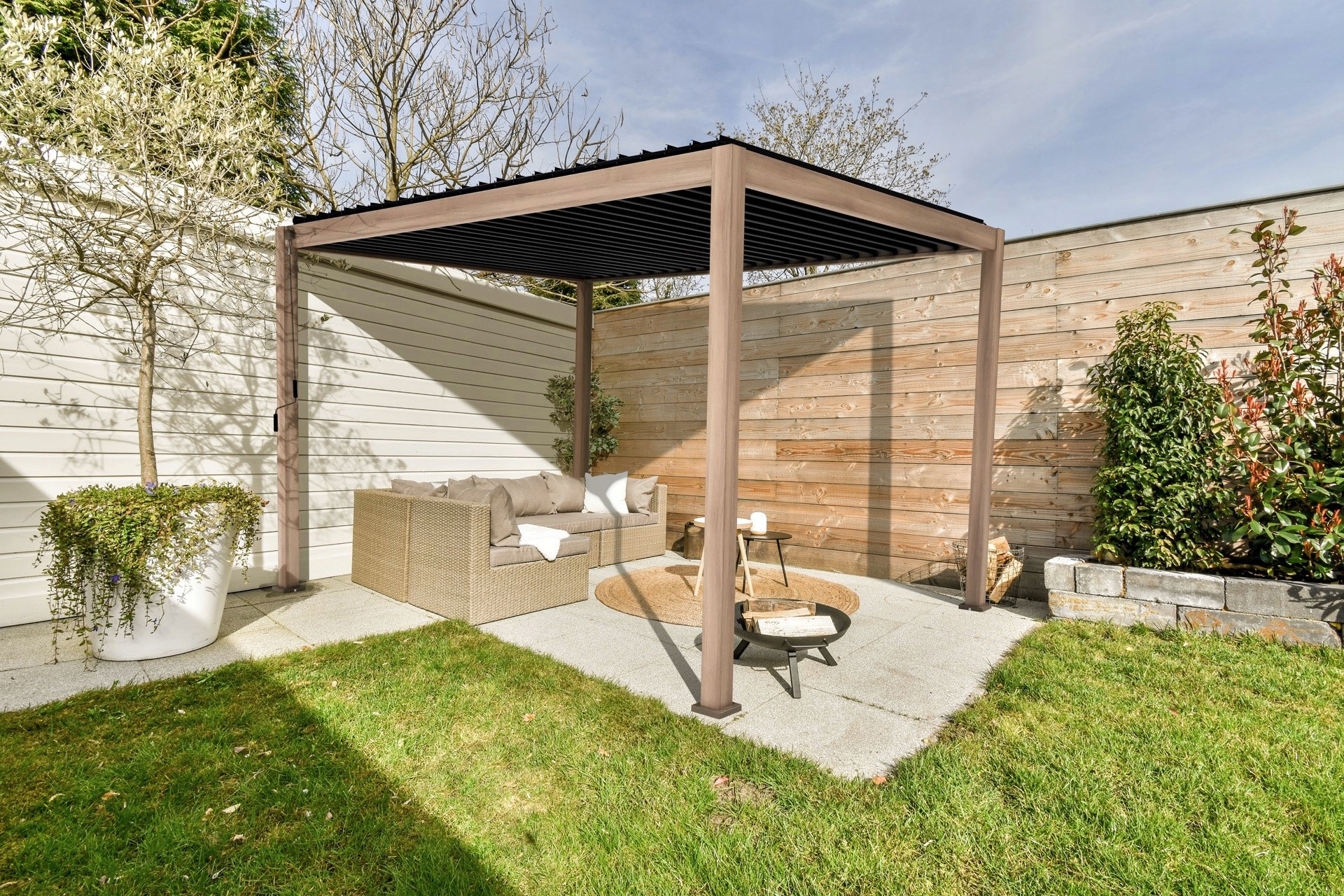 Рамки свободно регулируются с помощью рукоятки. Характерную решетчатую крышу поддерживают прочные алюминиевые стойки размером 111 х 111 мм. Такая конструкция обеспечивает эффективную защиту от солнечных лучей и дождя. Также имеется встроенный водосточный желоб, который стекает дождевую воду по алюминиевым стойкам. Однако обратите внимание, что во время сильного дождя вода может попасть в перголу, поскольку пергола была спроектирована с учетом различной защиты от солнца и дождя.