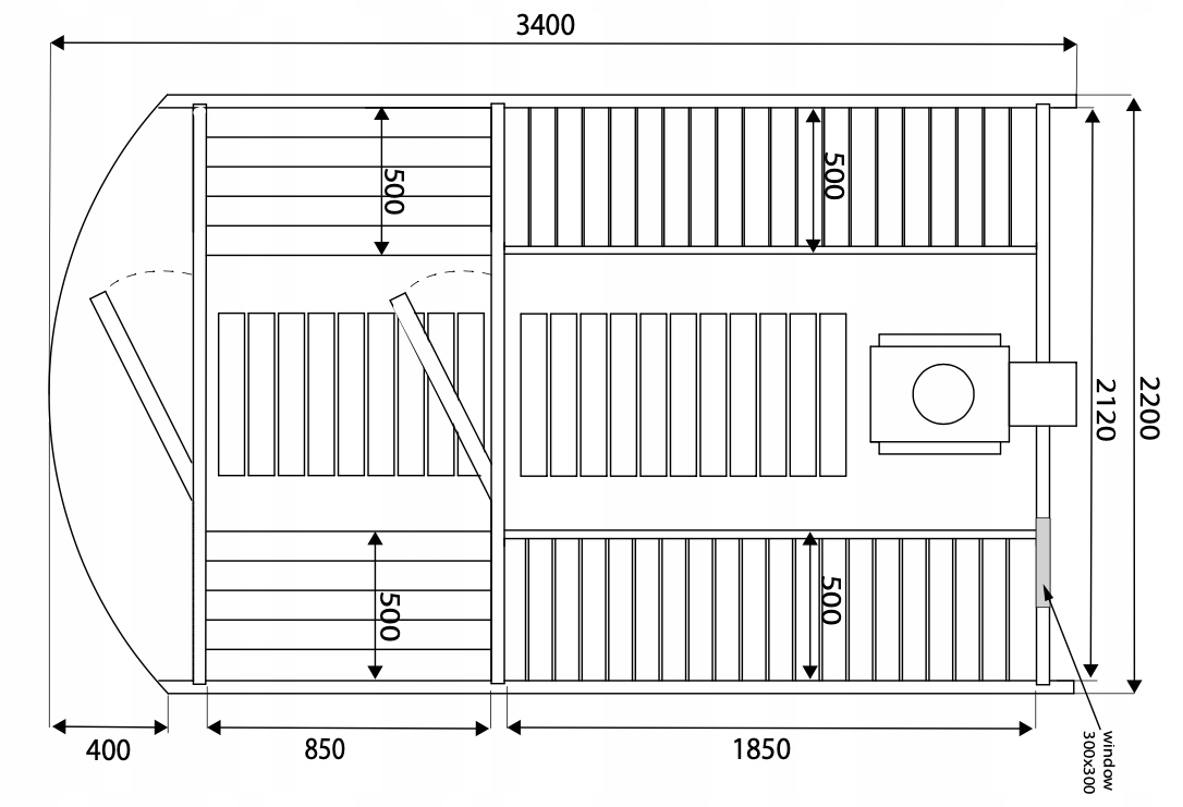 3. Бочка 340 см с залом - идеальна для зимнего использования, длина парилки увеличивается до 185 см.