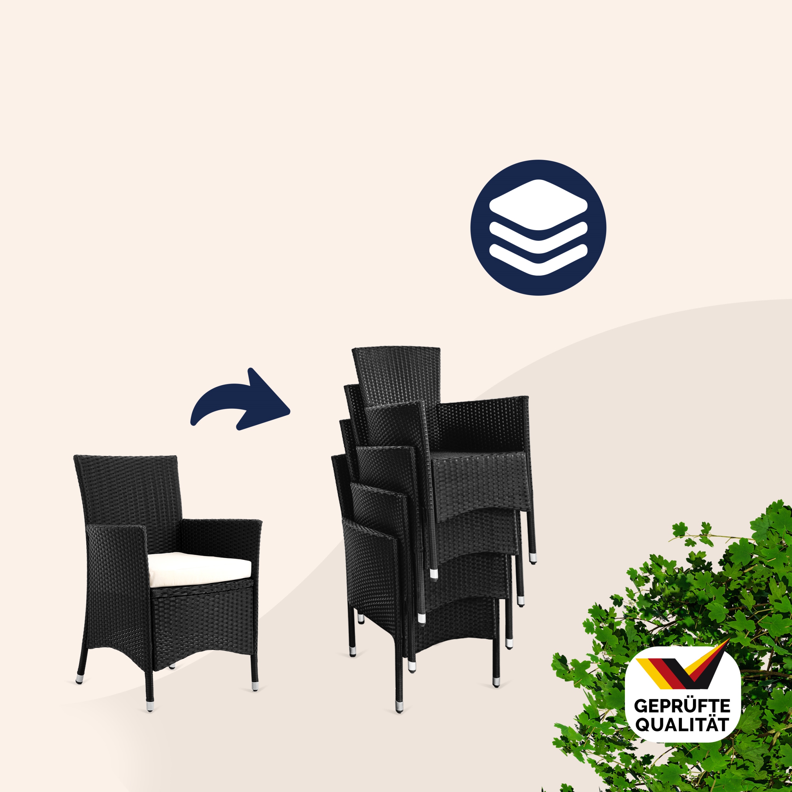 Этот стильный набор садовой мебели из 13 частей состоит из садового стола и 6 сшитых стульев с подушками толщиной 7 см, которые обеспечивают самый высокий комфорт.