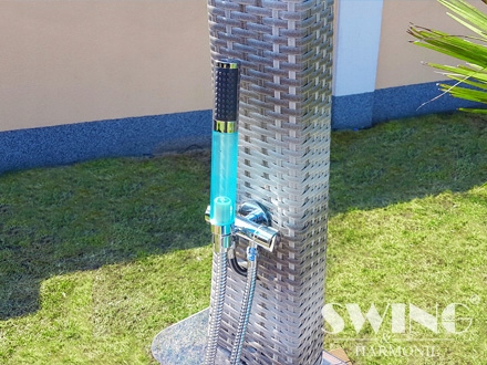 Polyrattan-Dusche «Wave» от Swing & Harmonie® — это элегантный садовый душ, душ имеет большую душевую лейку. Он позволяет регулировать поток воды с помощью насадки душа, ручного душа или того и другого одновременно. Душевая головка и ручной душ оснащены светодиодной подсветкой, которая включается автоматически во время принятия душа. Электричество вырабатывается потоком воды, поэтому батареи не нужны. Просто подключите свой смартфон, планшет или ноутбук через Bluetooth с помощью прилагаемого звукового модуля и воспроизводите любимую музыку с помощью встроенного динамика.