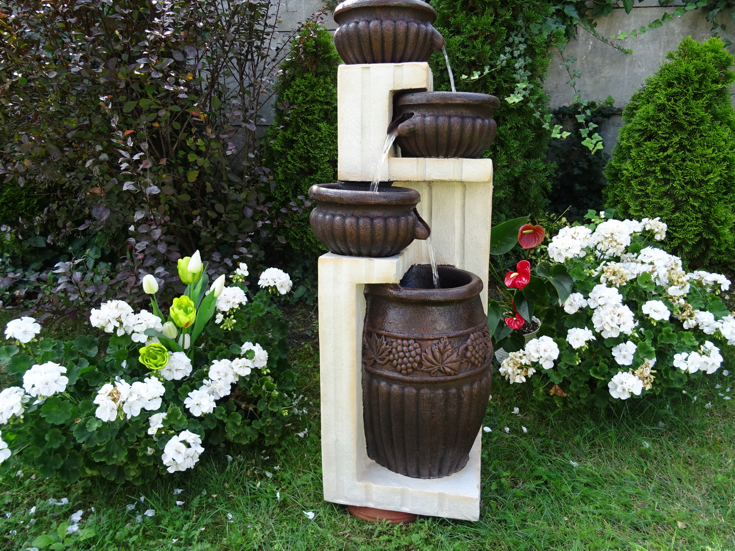 фонтан в замкнутом цепи, вода в нижнем резервуаре, накачанном в верхний сосуд, откуда каскад - под влиянием гравитации течет вниз ...... ... это не слышно здесь, но это приятный и приятный опыт закрытия глаз - вы можете чувствовать впечатление, что близко к естественному потоку,
