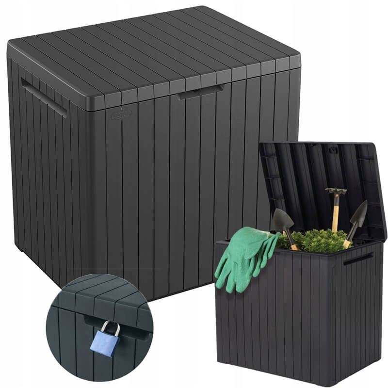 ► Мебель изготовлена из прочного пластика, полностью устойчивого к погодным условиям, таким как УФ-лучи, дождь и снег. Материал не требует ухода и дополнительного ухода, что является его огромным преимуществом. Его легко содержать в чистоте, а соответствующая система вентиляции предотвращает попадание влаги или неприятных запахов внутри бокса.