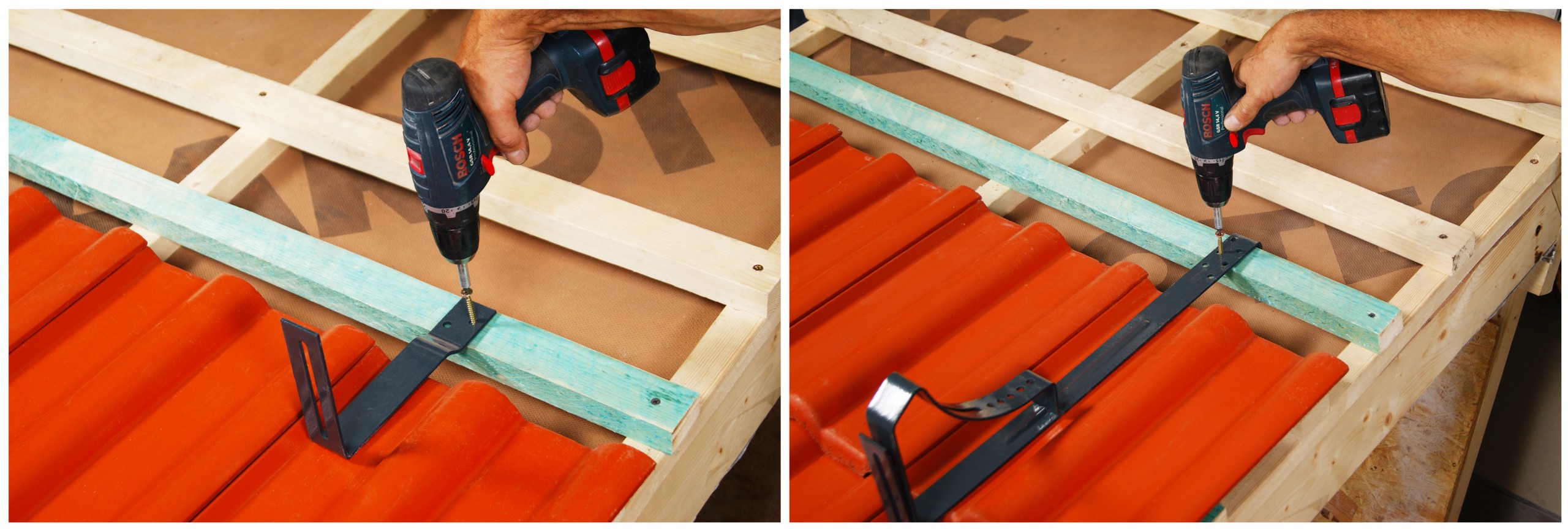 Соответствующее профилирование кронштейна DBDC-KARP позволяет устанавливать опоры или ступени на крышах, покрытых керамической черепицей внахлест, бетонной черепицей и плоской черепицей.