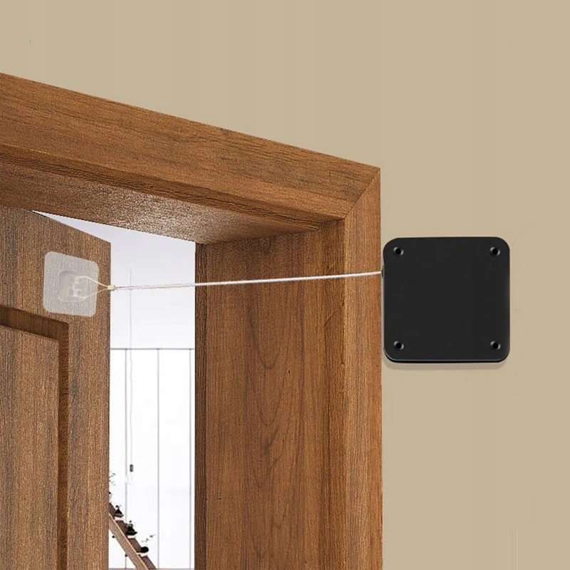 - Очень простая установка и эксплуатация - достаточно приклеить доводчик на стену, а специальную ручку на дверные створки, затем натянуть сталь кабель и зацепите его за ручку.