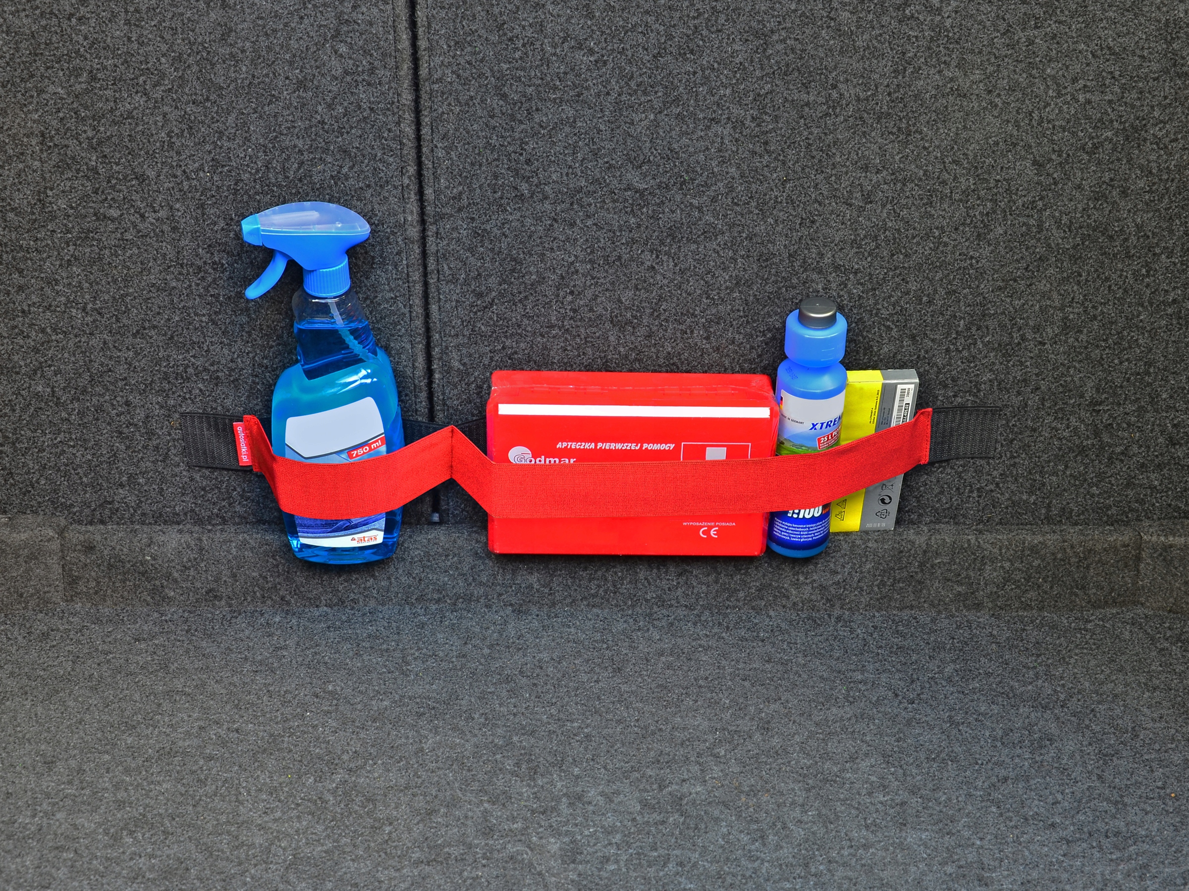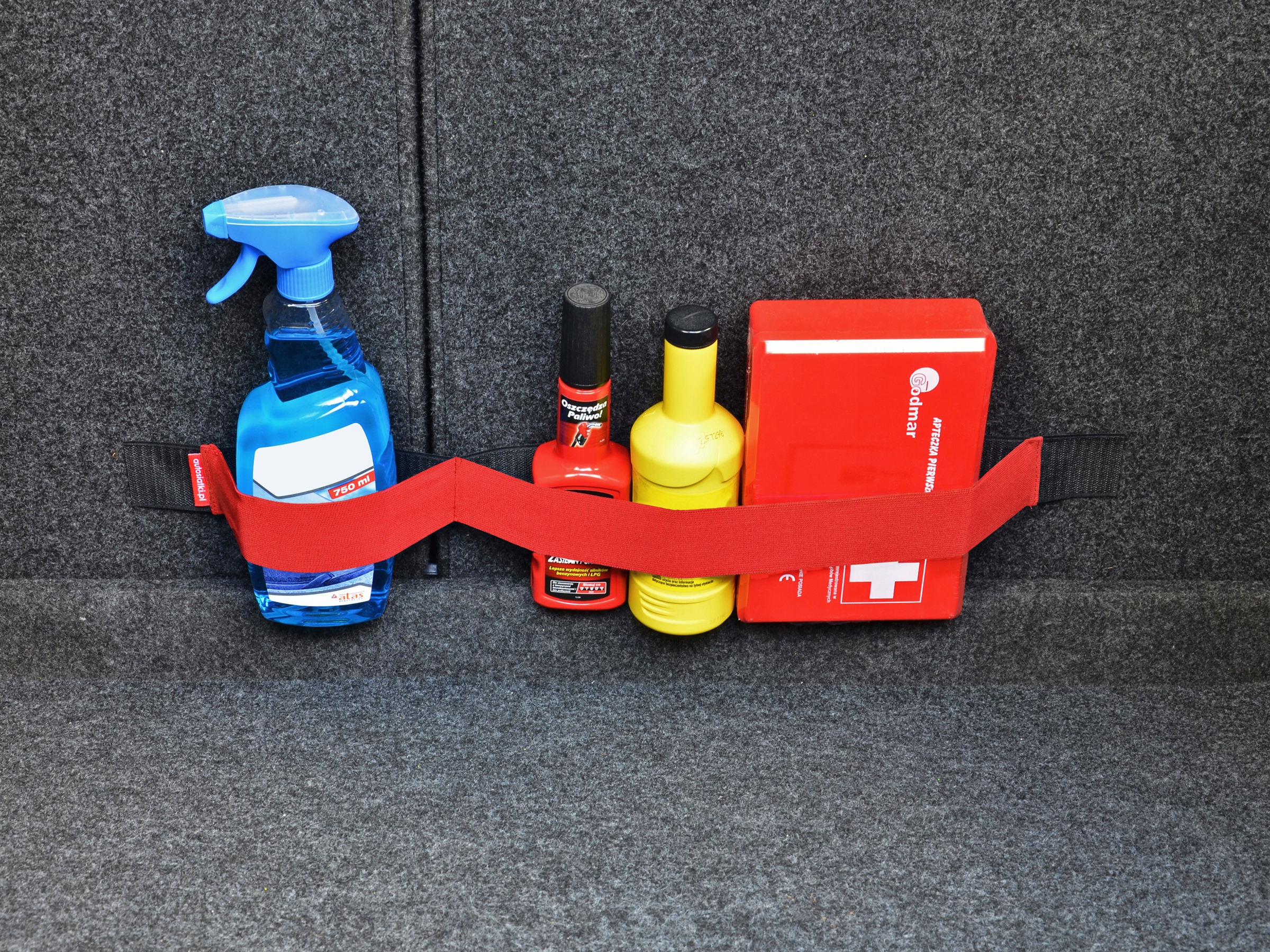 Авторемни – это быстрый и удобный способ упорядочить необходимые вещи, которые мы перевозим в багажнике. Изделие состоит из прочной ленты-липучки, которую мы прикрепляем к обивке автомобиля, и гибкой резины, разделенной на два асимметричных отделения, под которые можно поместить, например, жидкость для омывателя ветрового стекла, аптечку, масло или другие аксессуары, необходимые в автомобиле. Ручка предотвращает перемещение предметов во время транспортировки, а также предотвращает проливание жидкостей. Мы предлагаем самоклеящиеся липучки пяти цветов и разной длины, поэтому каждый найдет продукт, который оправдает все его ожидания.