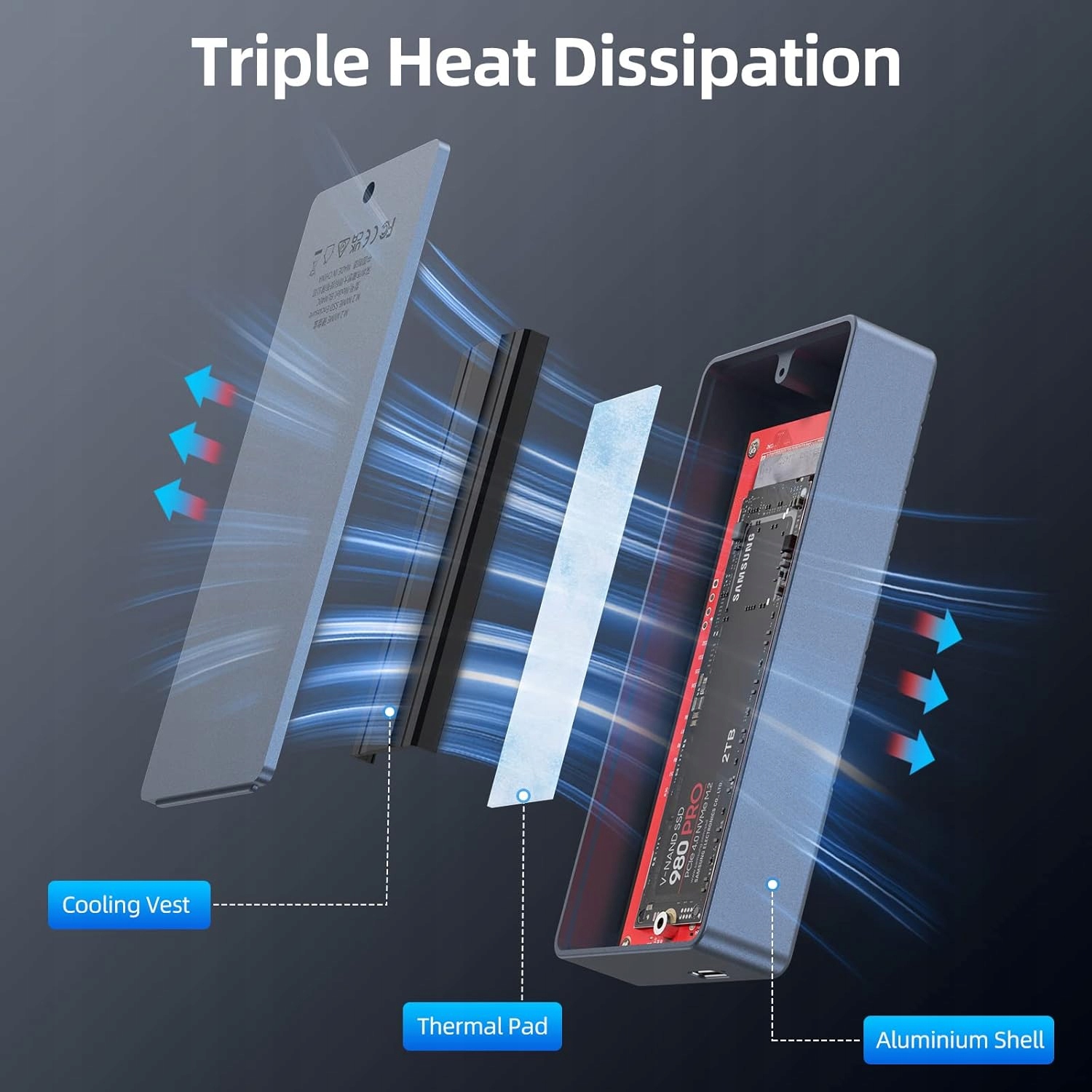 Корпус 40 Гбит/ с M.2 SSD характеризуется тройным эффектом рассеяния тепла благодаря алюминиевому сплаву, схеме охлаждения и тепловой прокладке, эффективно предотвращая перегрев и тягу, благодаря которого SSD работает быстрее с более низким потреблением энергии и дольше. Тепловая стиральная машина расположена в промежуточном слое коробки, чтобы найти ее, откройте промежуточный слой p>