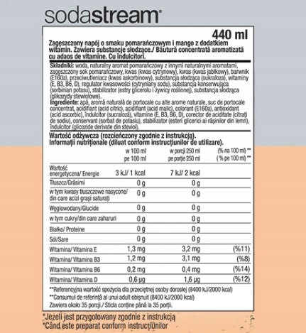 оранжево-манго, грейпфрута, 7UP Zero и Pepsi Zero-это ароматы, которые, благодаря концентратам SodaStream, вы можете приготовить на своей кухне. Разбавление концентрата водой.