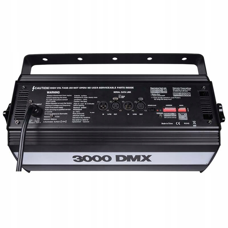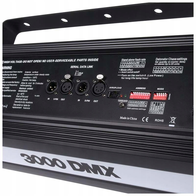 Стробоскоп Light4Me Strobe 3000W имеет прочный металлический корпус, устойчивый к высоким температурам, возникающим в результате работы лампы-вспышки, что гарантируетвысокую безопасностьпри использованиирефлектора. б>. ✅ Удобство использования обеспечивается 3- и 5-контактными разъемами XLR, позволяющими управлять работой стробоскопической горелки по протоколу DMX. , а также удобные в использовании переключатели dip-переключатели , позволяющие вручную управлять агрегатом, его адресацией и выбором режима работы. В режиме DMX в нашем распоряжении есть 3 или 4 канала, отвечающих, среди прочего: для частоты мигания и продолжительности одной вспышки. Благодаря этому мы легко можем создать эффект рамки изображения на дискотеке или на техновечеринке или на бурных вспышках в бурных вспышках b>кинотеатр или киносъемочная площадка (функция Случайная). Программируемые возможности рефлектора дополнительно развиваются за счет 6-контактного разъема AVR.