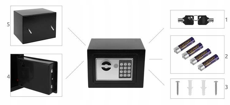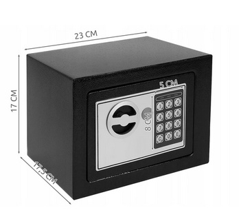 Надежное качество изготовления и возможность установки собственного шифрования обеспечивают надежность и безопасность, а также гарантируют, что никто другой не получит доступ к контенту. Сейф прочен и устойчив к повреждениям, а также относительно тяжел. Таким образом, снижается риск кражи всего сейфа и выноса его незамеченным за пределы объекта или помещения, где он находится. Закрытие двери толстыми засовами эффективно выполняет дополнительную функцию безопасности, предотвращая ее взлом. Сейф обеспечивает возможность хранения всех важных предметов. , включая: деньги, ювелирные изделия, документы или небольшое электронное оборудование, а также носители информации с конфиденциальными данными. Размеры внутреннего пространства сейфа позволяют разместить в нем листы формата до А5 и всевозможные мелкие и дорогостоящие предметы. Дно сейфа можно обшить прилагаемой тканевой подкладкой. Он защитит украшения или другие ценные вещи от случайных повреждений и царапин. На передней части двери расположена электронная панель управления. Она питается от 4-х батареек (входят в комплект), расположенных на внутренней стенке двери. У нас также есть доступ к традиционному ключевому замку. Позволяет аварийно открыть сейф в случае забытия кода. Поэтому ключ следует хранить вдали от сейфа, чтобы предотвратить несанкционированный доступ. На двери установлена ручка, используемая для открытия двери сейфа. Светодиоды, расположенные над панелью, предоставляют информацию о состоянии батареи и о том, правильно ли мы выполняем действия. Если батарею необходимо заменить, после открытия сейфа загорится светодиод. С помощью панели вы можете установить и изменить свой персональный код доступа. Если пароль введен неправильно три раза, прозвучит звуковой сигнал и клавиатура заблокируется на 30 секунд