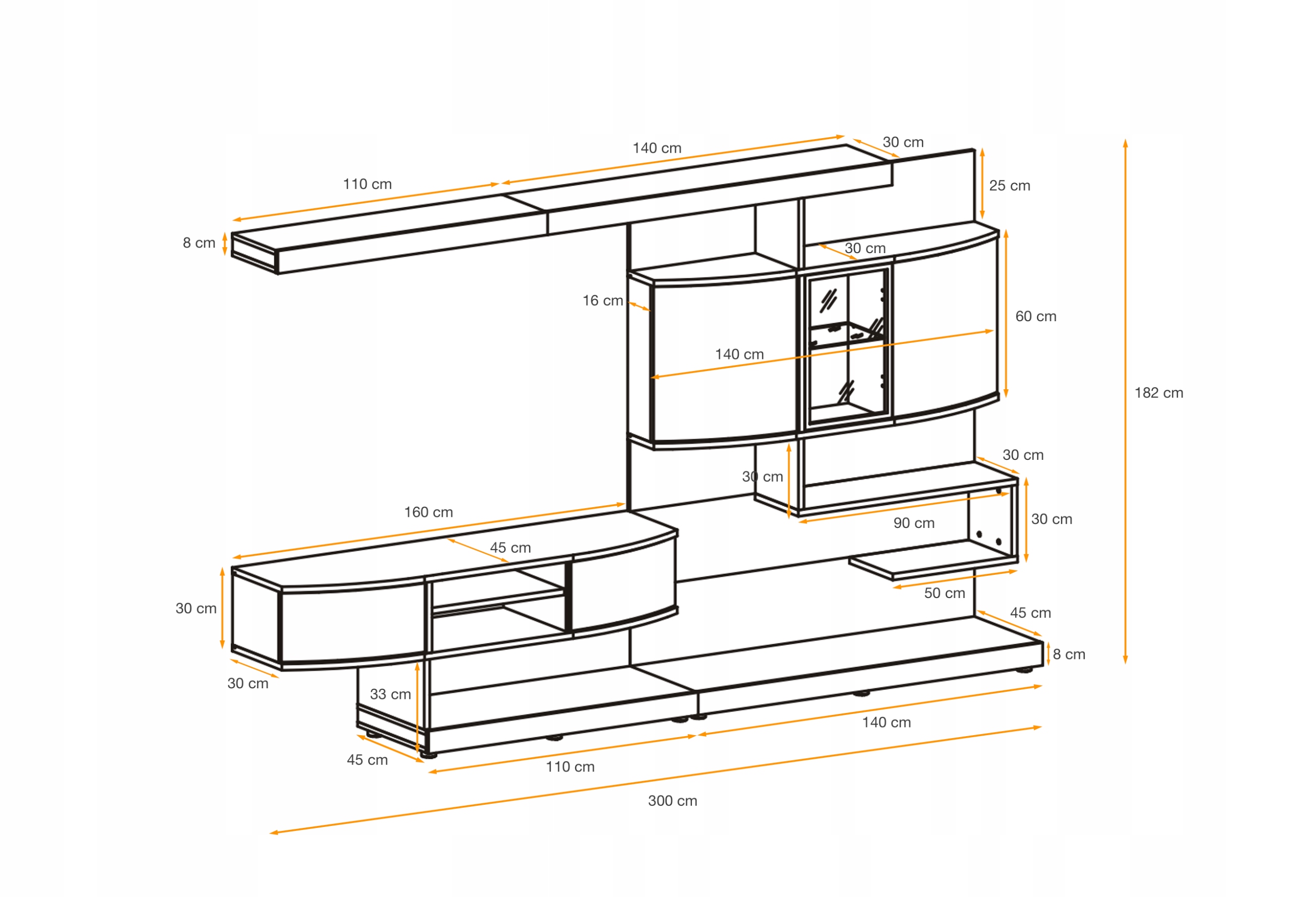 Общие размеры (Ш/В/Г): 300 см/182 см/45 см
