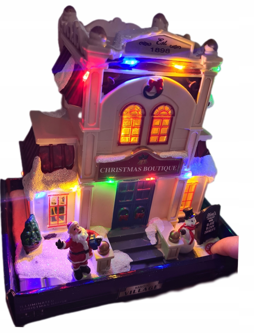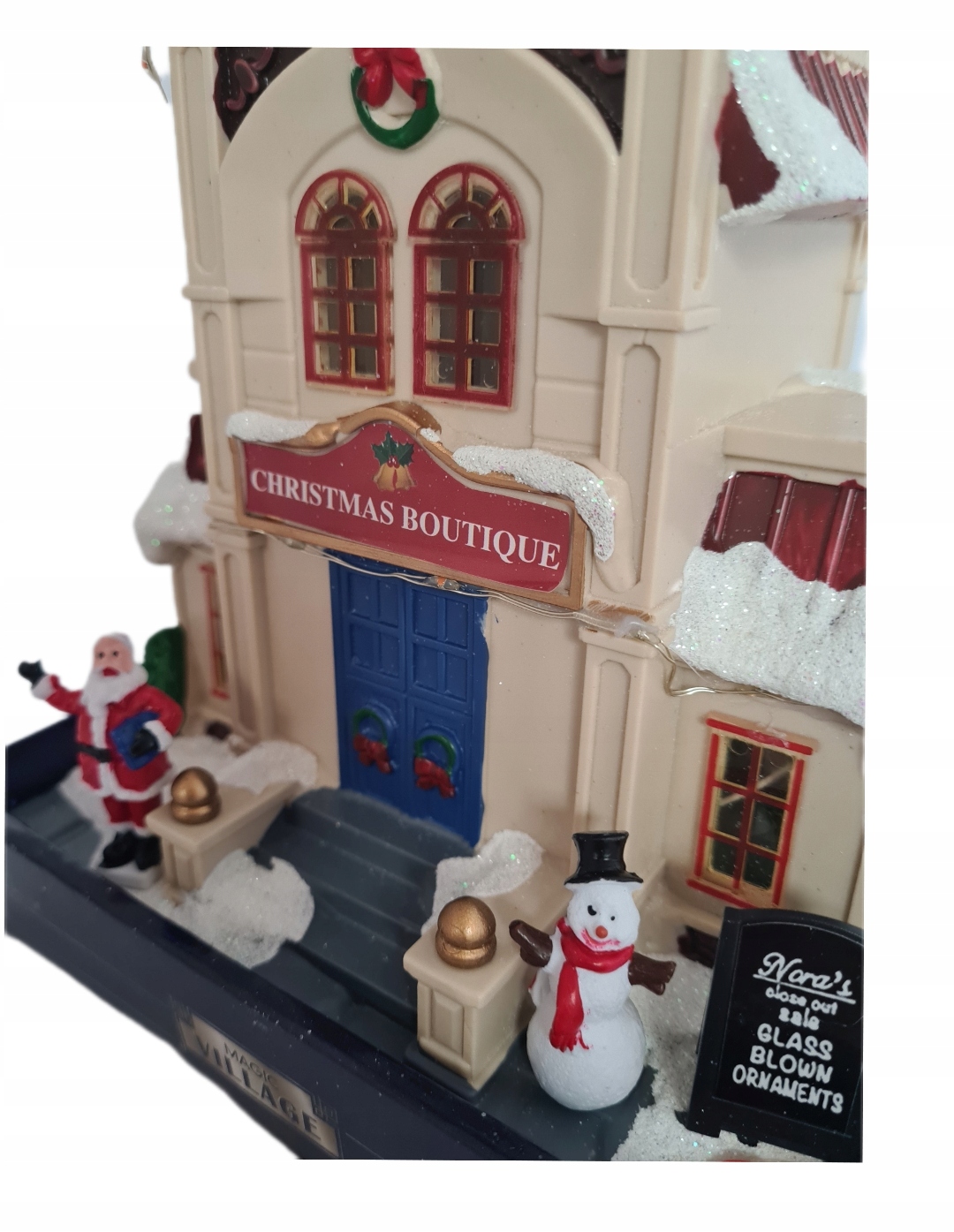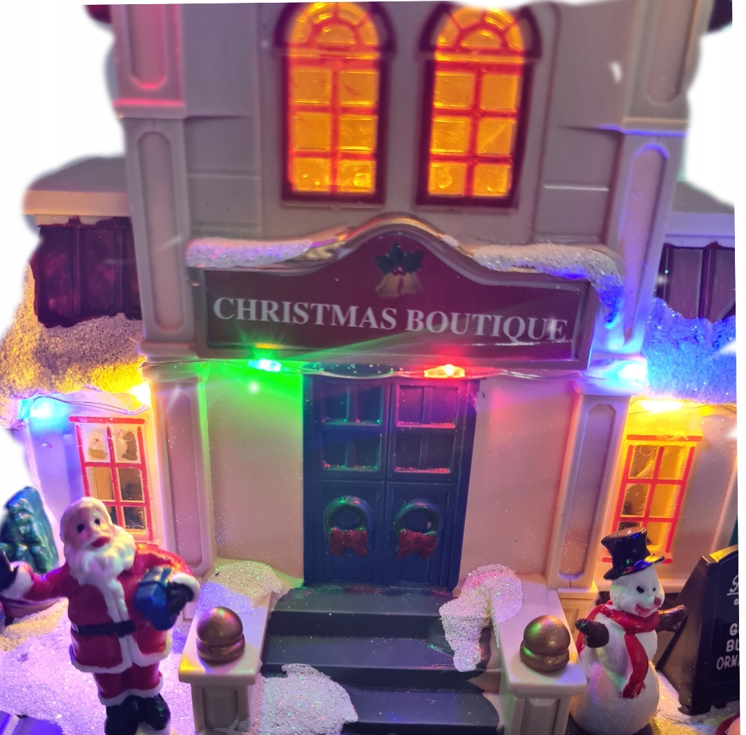 Рождественская сцена с бутиком, Дедом Морозом, снеговиком, блестками, светодиодным освещением.