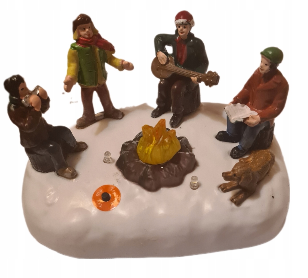 Рождественская сцена с людьми, сидящими и поющими вокруг костра, светодиодное освещение.