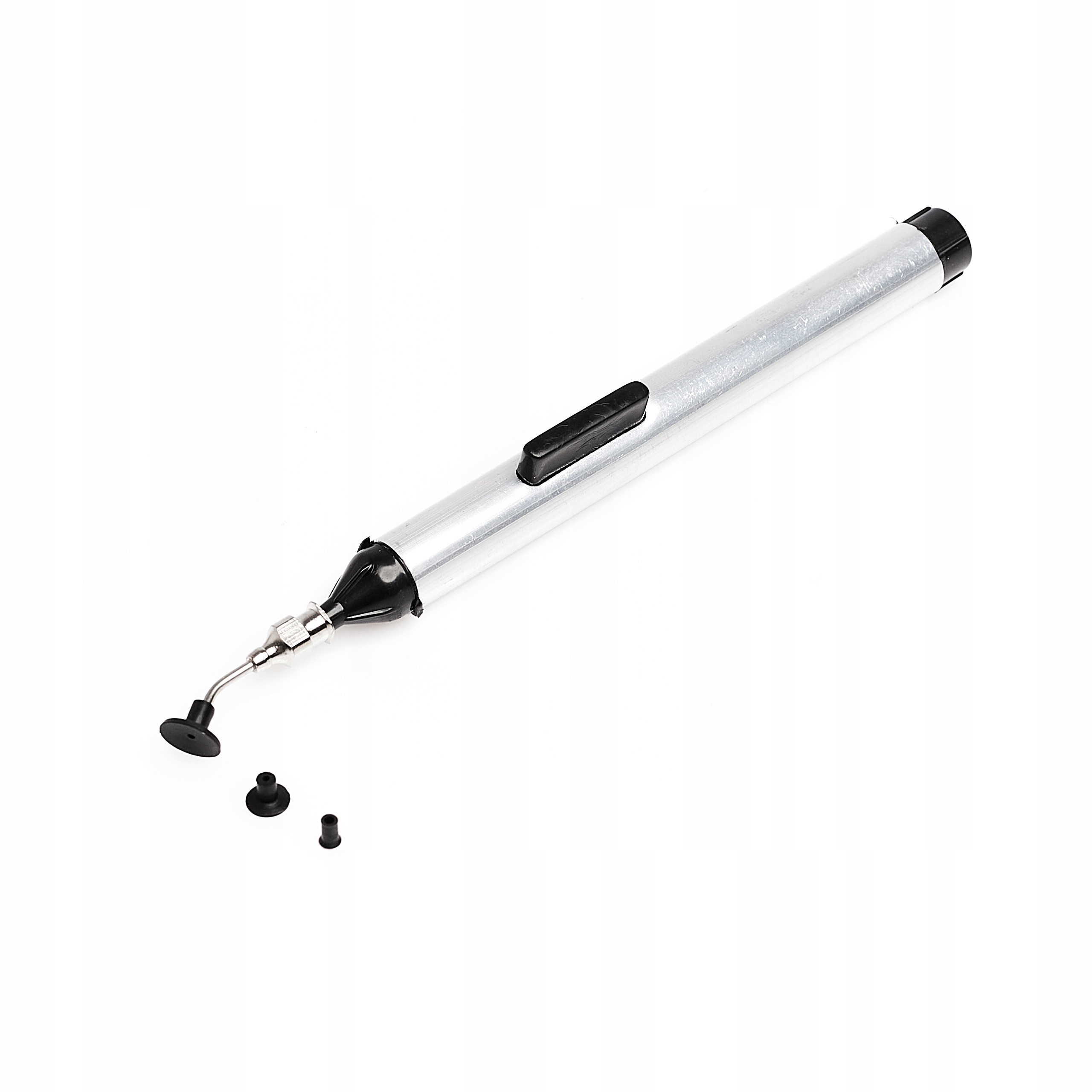 Вакуумный захват, используемый для ношения мелких предметов без использования пинцет. Его можно использовать для переноса и размещения на плитках PCB, интегрированных в небольшие корпусы, например, Итак, TSSOP, BGA, QFP. Вакуум в устройстве создается путем нажатия кнопки. Это приводит к всасыванию силиконового наконечника, устойчивого к высоким температурам к переданему элементу.