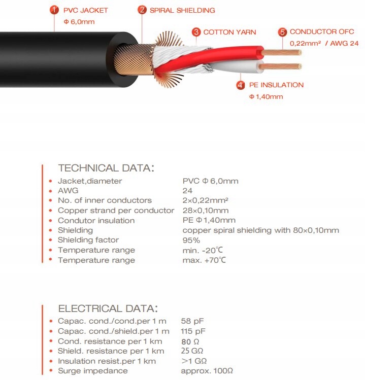 Микрофонный кабель, самка XLR -самца XLR, длина 10 метров, перекрестные сечения проводов 2x 0,22 мМ², скрещенное медное экранирование 95%, емкость 58 пФ/м, диаметр кабеля 6,0 мм, толщина изоляции 1,4 мм, температурный диапазон от -20 ° C +70 ° C, металлические соединения, черные 1,4 мм, температурный диапазон от -20 ° C +70 ° C, металлические соединения, черная.