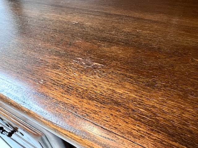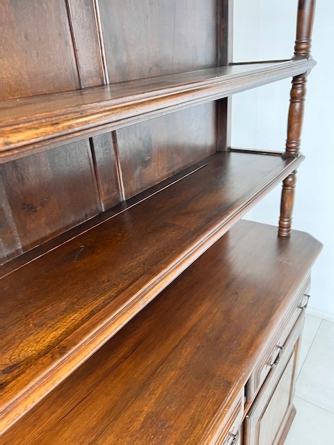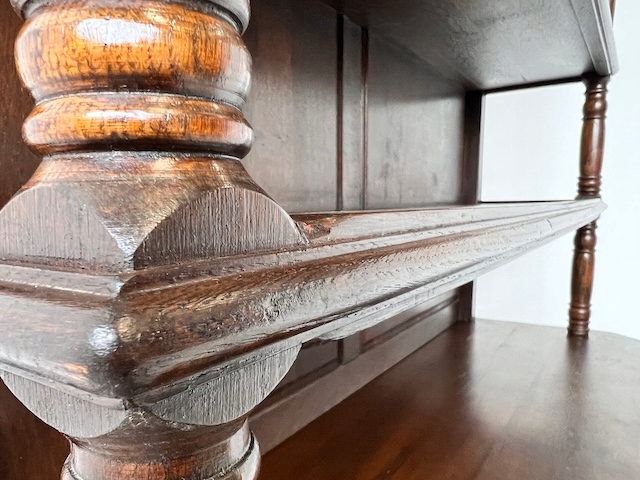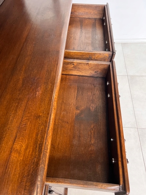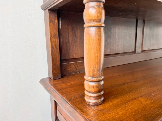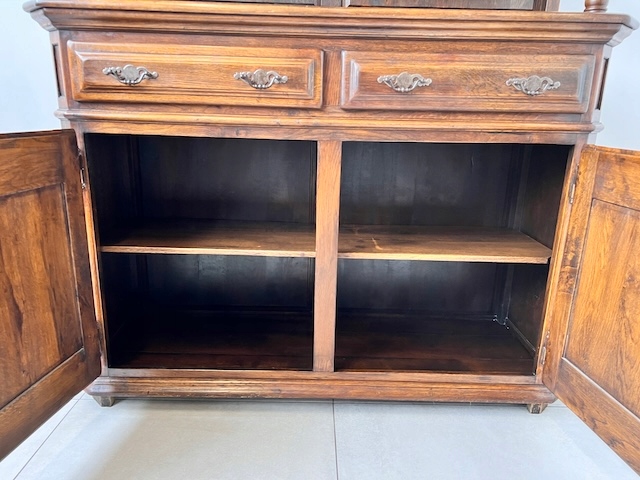 Серван в деревенском стиле из дуба. Простая по форме, очень красивая. Верхняя часть в виде полочки, открытая. Нижняя часть представляет собой закрытый комод. Очень практичный и вместительный предмет мебели. Добротно сделано. Он сохранился в хорошем состоянии. Единственный недостаток – слегка поврежден шпон на столешнице. Других повреждений и дефектов нет. Имеет типичные следы использования. Интерьер ухоженный, замки функциональные, в комплекте есть комплект ключей. Сервант состоит из двух элементов. Он готов к вставке.