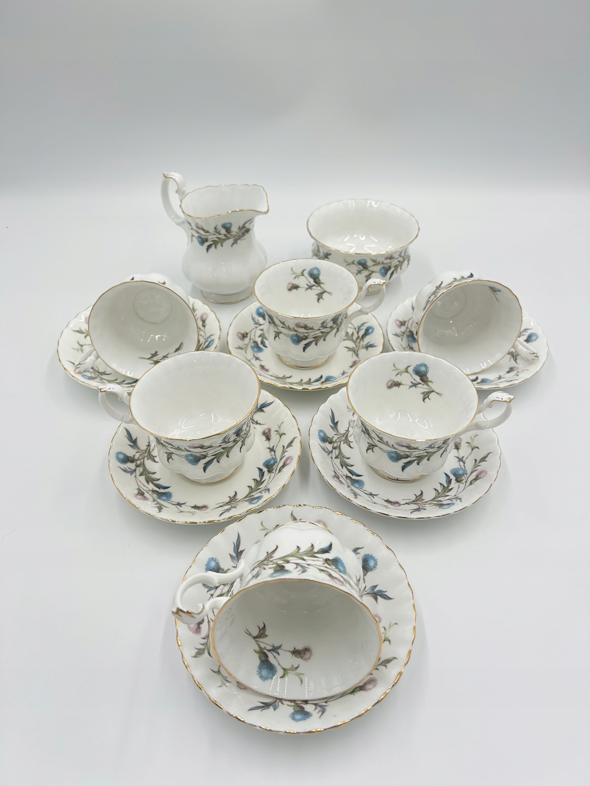 Предмет продажи — очаровательный чайно-кофейный сервиз Royal Albert из коллекции Brigadoon. Представленный набор состоит из 6 предметов-дуэтов - чашки с блюдцем, молочника и сахарницы.