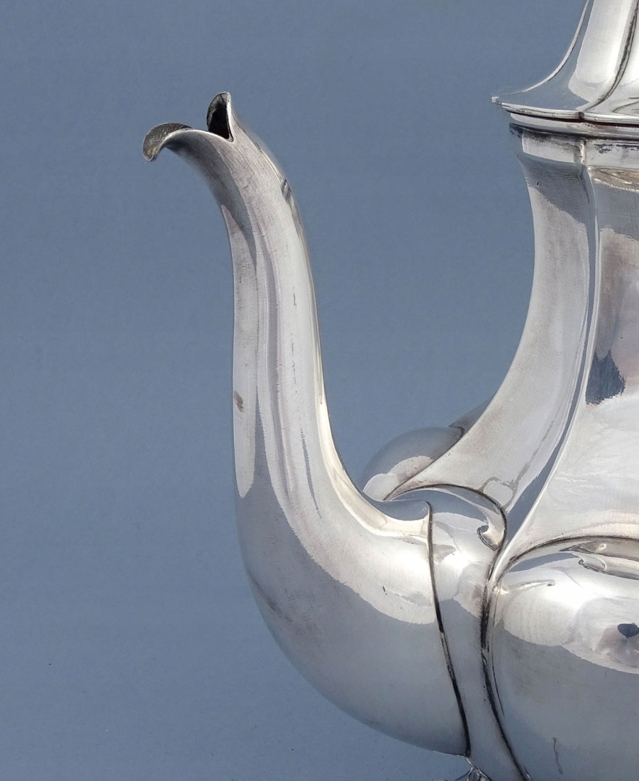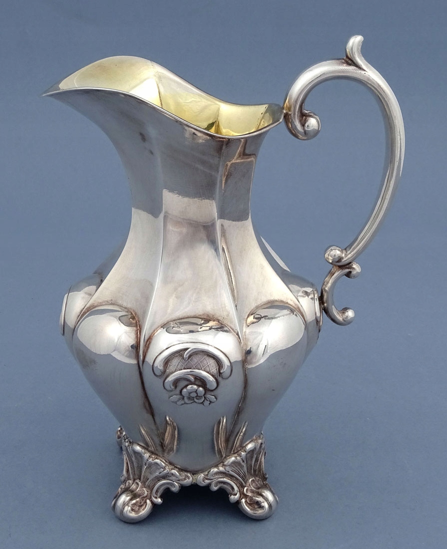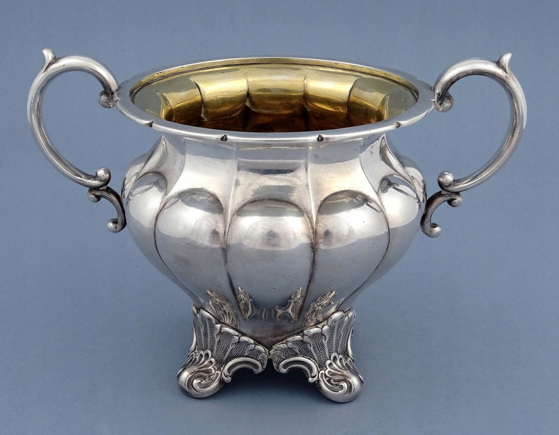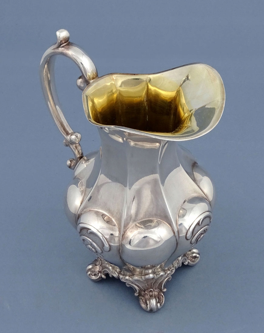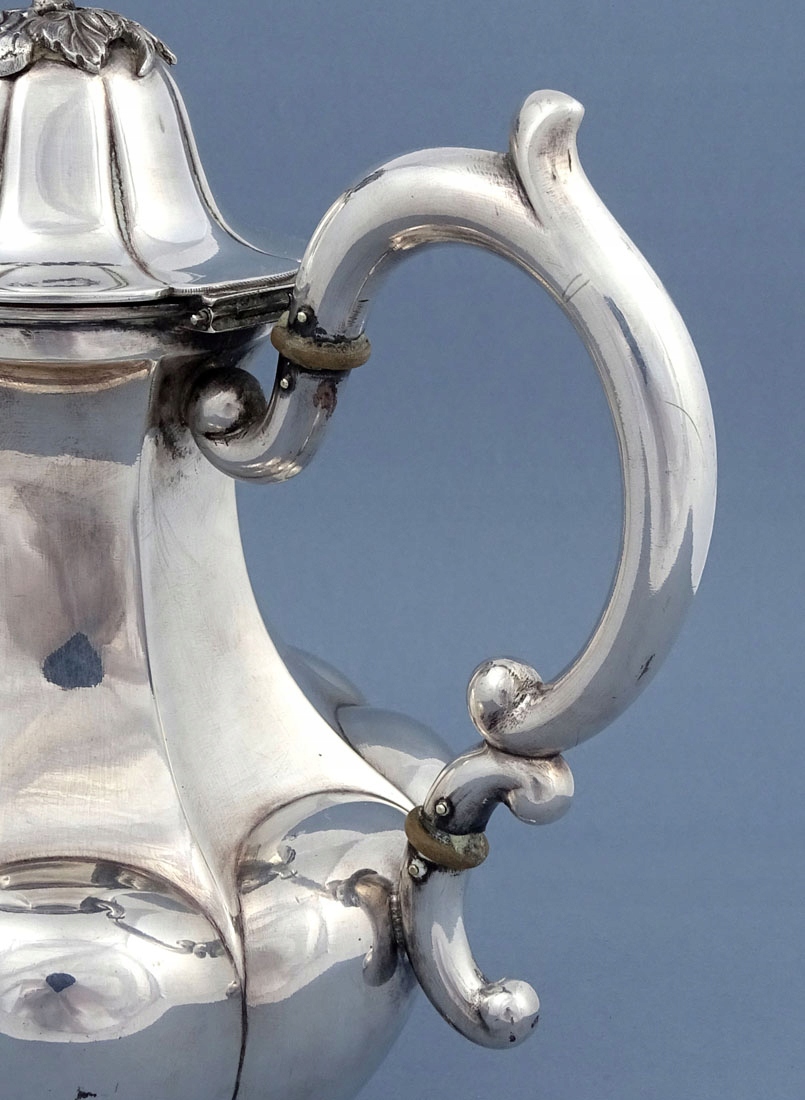 состоящий из кувшина, сахарницы без крышки и молочника. Каждый элемент имеет выпуклое тело, поставленное на четыре ножки в виде завитых листьев. Ручки в виде согнутых, два стебля соединены между собой, кофейник также имеет костяные изоляторы, внутренности емкостей позолочены.