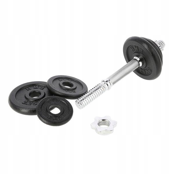 В комплект входят:гриф прямой 2 кг, 2 тарелки 0,5 кг, 2 тарелки 1 кг, 2 тарелки 2,25 кг и 2 звездообразных зажима 0,25 кг. Первый элемент был изготовлен из никелированной стали. Пластины, в свою очередь, чугунные.