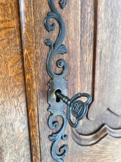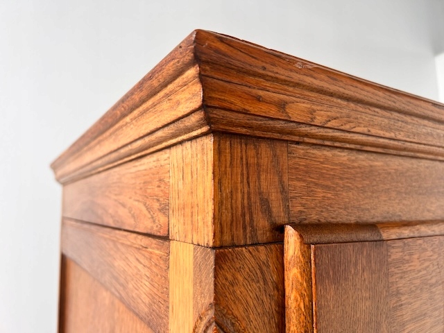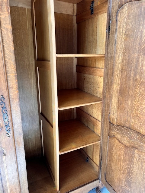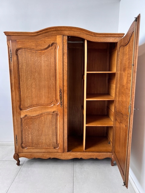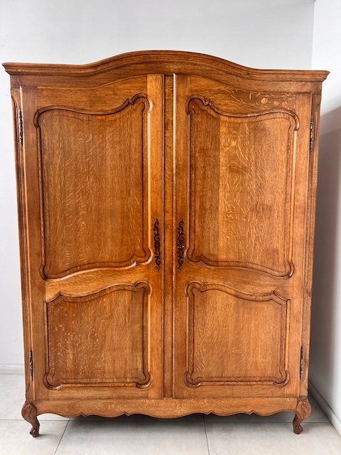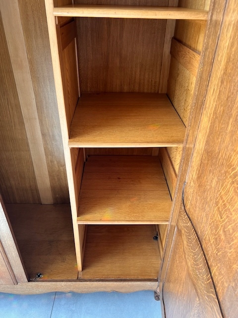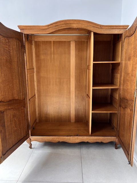Шкаф двухдверный. Он выполнен в стиле Людвика. Внутри он разделен; более узкая часть с полками и более широкая часть со штангой. Замок функциональный, в комплекте есть ключ. В целом он в хорошем состоянии. Имеет типичные следы использования. Внутренняя стенка имеет незначительные повреждения. Шкаф разбирается и по частям приедет к новому владельцу. Шкаф готов к установке.