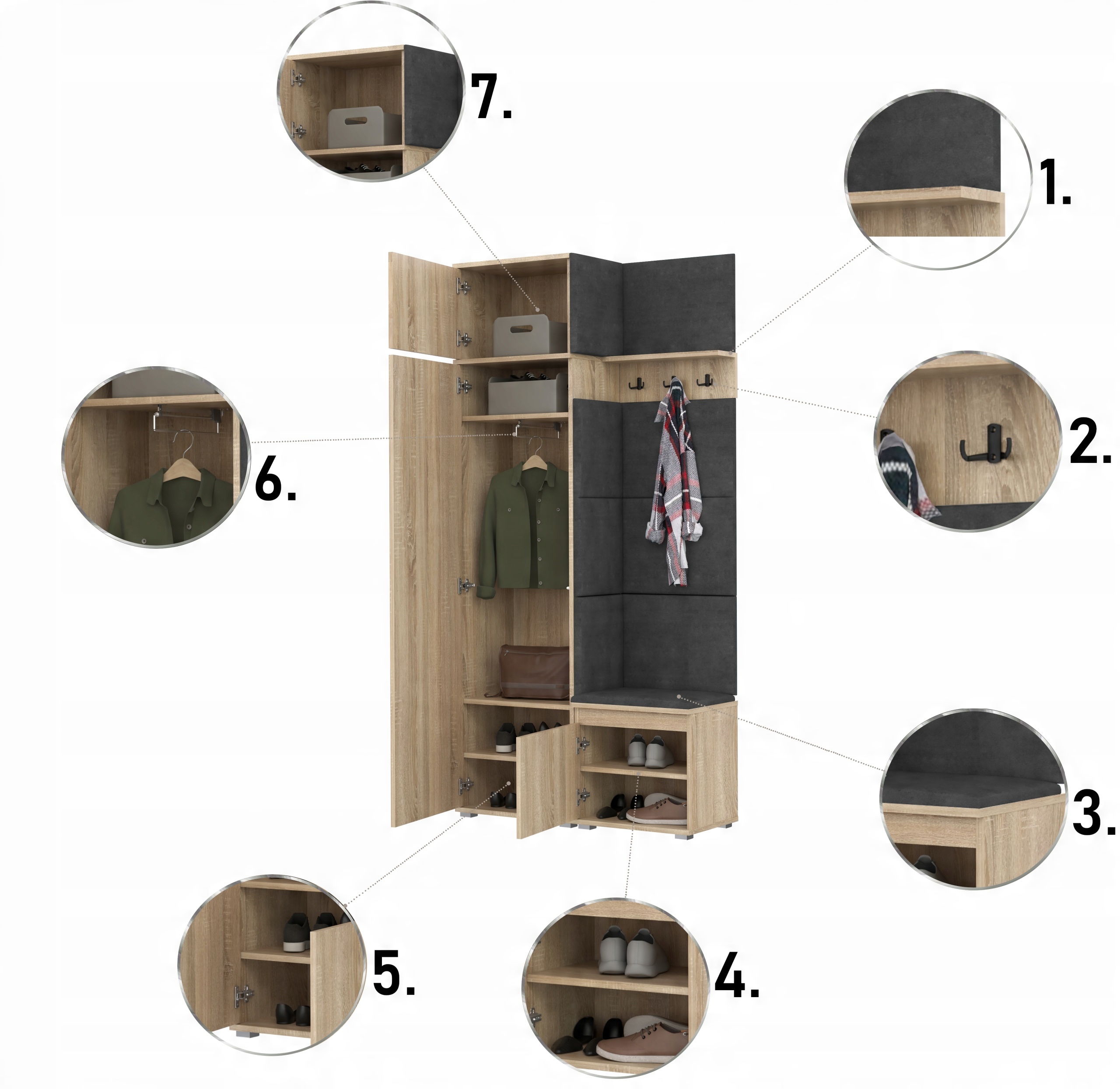 Современный, функциональный комплект для прихожей, доступен в 3-х цветовых вариантах и трех цветах сиденья и панелей.< /п>