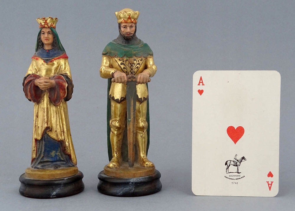 Фигуры помещены в оригинальную коробку с выпуклой стороной крышки, на которой изображен нарисованный букет цветов. в центре, узоры рокайль по углам, и все это деликатно сдержано. Внутри находятся шахматные фигуры, одна съемная полка, а другая стационарно установлена. Шкатулка с функциональным замком и ключом.