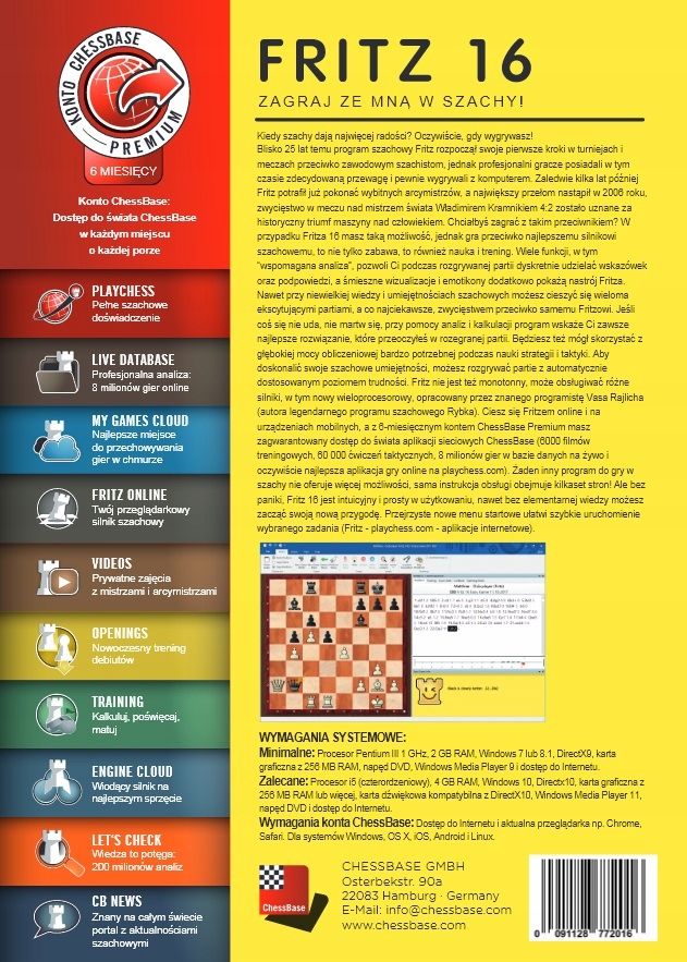 Если вы хотите сразиться с противником, обладающим очень совершенным искусственным интеллектом, или принять участие в чемпионате с живыми противниками, закажите FRITZ 16 PL сегодня и наслаждайтесь возможностями, предлагаемыми лучшей шахматной игрой на рынке!