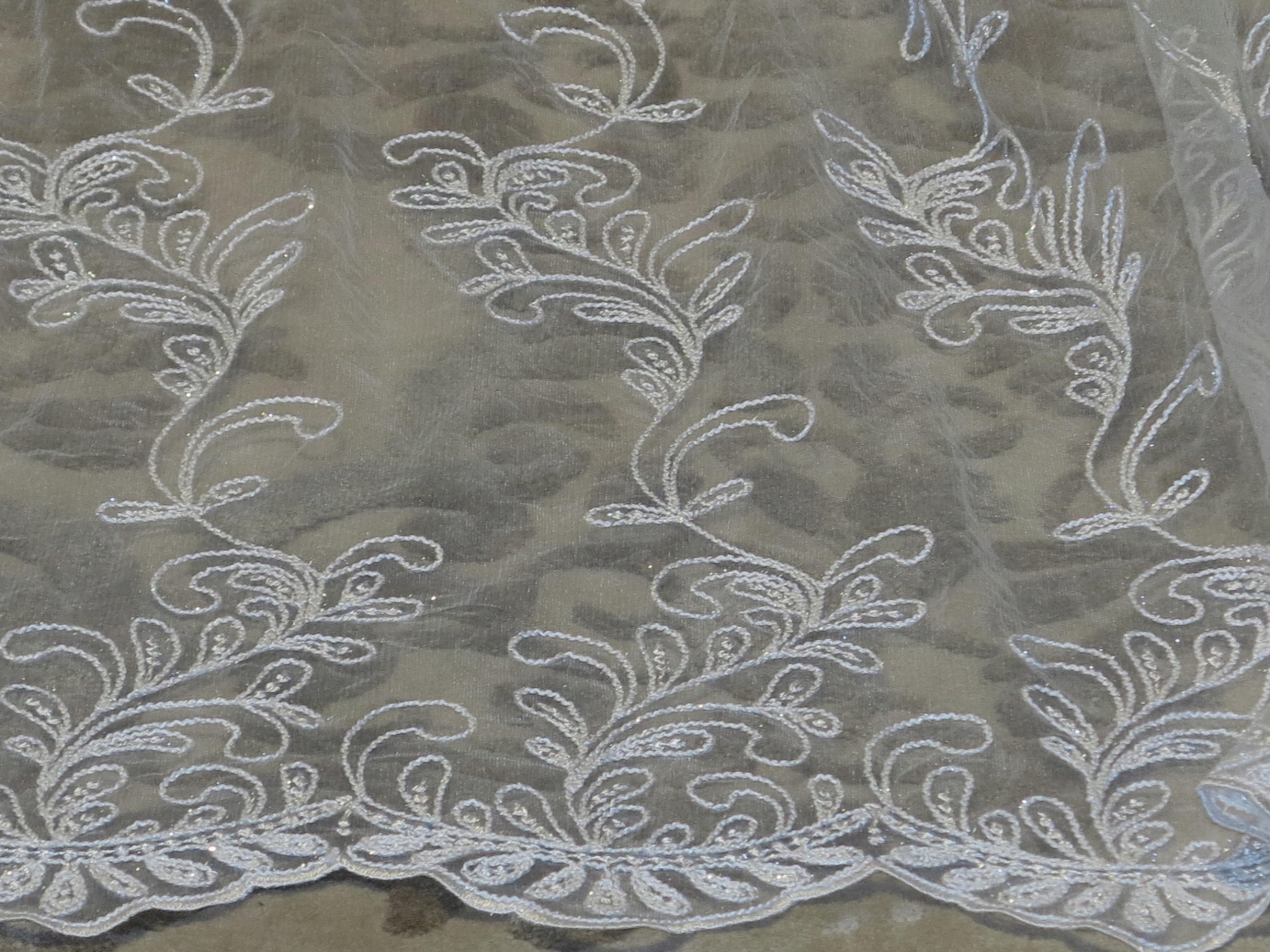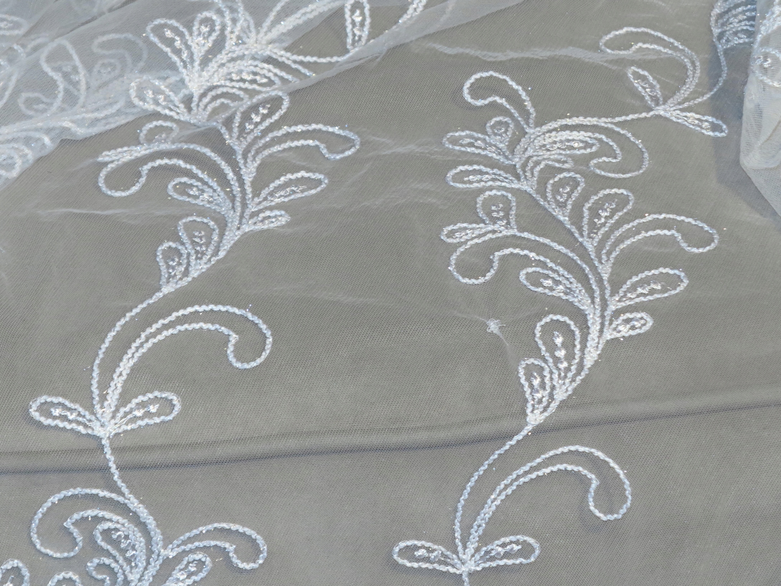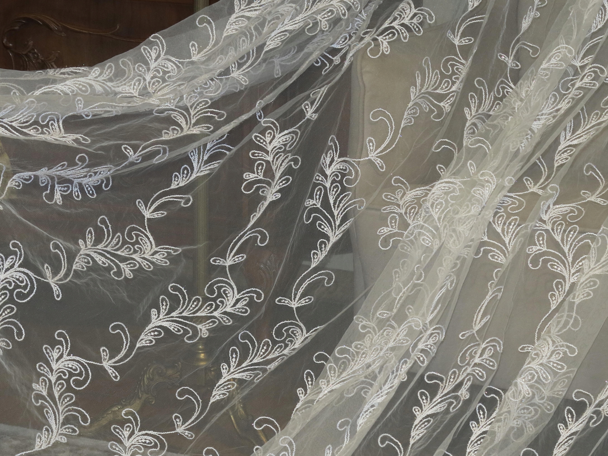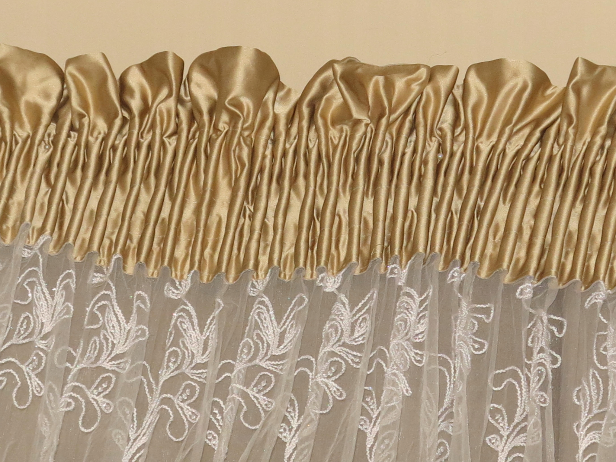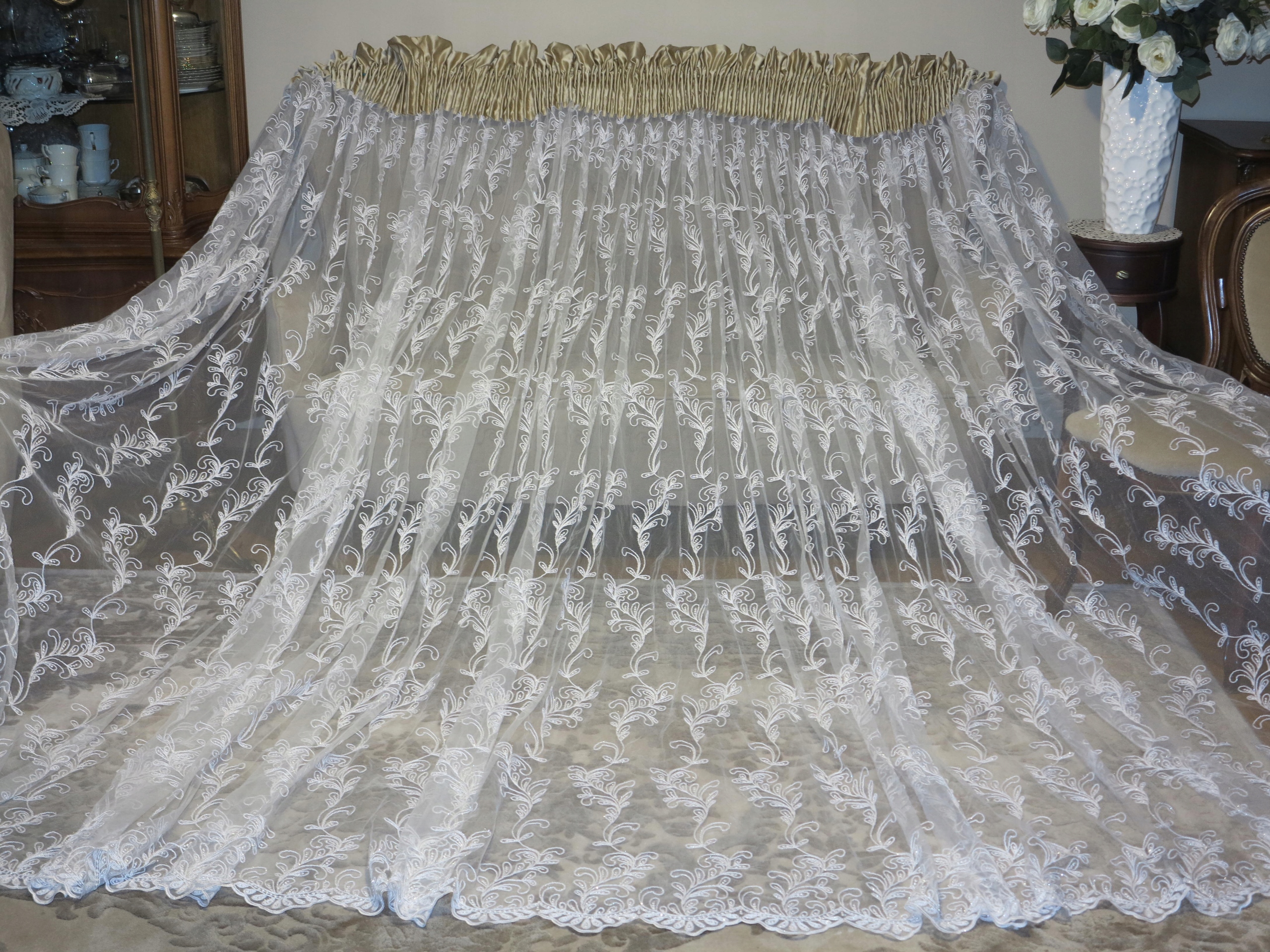 КРАСИВУЮ БЕЛО-ТЮЛЕВУЮ ШТОРУ, ВСЕ С ВЫШИВКАМИ (МОДЕЛИ ТАКЖЕ ПОСТАВЛЯЮТСЯ С БЛЕСТЯЩЕЙ НИТЬЮ), С ДЕКОРАТИВНОЙ ОЧЕНЬ ШИРОКОЙ ЗОЛОТОЙ АТЛАСНОЙ ПОЛОСОЙ НА ВЕРШИНЕ. ПОЯС СОСТОИТ ИЗ ДВУХ СЛОЕВ ТКАНИ, ОН РАВНО НАЛОЖЕН НА ОЧЕНЬ ШИРОКУЮ ЛЕНТУ ШИРИНОЙ 15см, С БОЛЬШИМ РАЗБОРОМ СТРУНЫ ДЛЯ РАСХОДА ПО ШИРИНЕ.