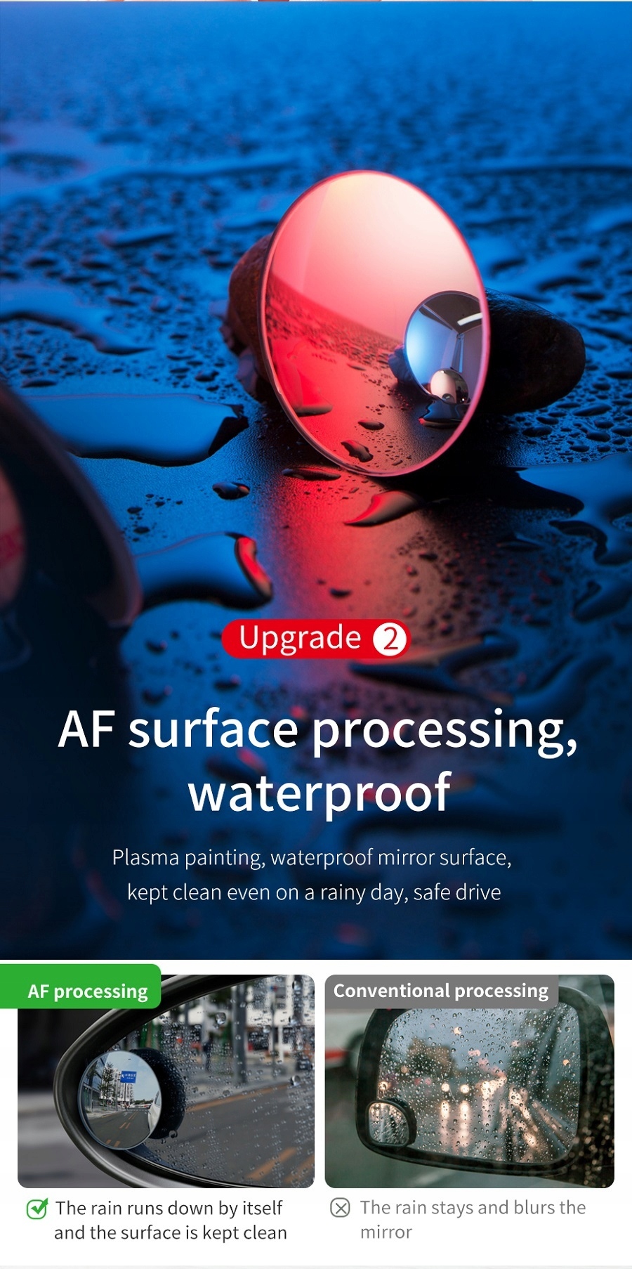 Изделие Baseus состоит из 2-х зеркал, которые за счет получения оптического угла обзора и закругленного стекла увеличивают дальность обзора. видения дороги. Покрытие АФ водонепроницаемое с плазменным покрытием, что дает нам эффект сухости даже в дождливую погоду.
