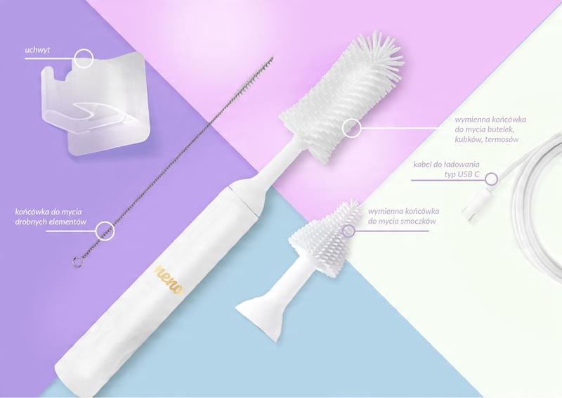 Neno Lavar — универсальная водонепроницаемая электрическая щетка, которая является альтернативой традиционным чистящим средствам. В комплект входят две вращающиеся насадки, которые позволяют точно и быстро очищать бутылочки, соски, чашки, бутылки с водой и термосы. Щетка была разработана таким образом, чтобы свести к минимуму риск скопления вредных микроорганизмов на поверхности. Возможность быстрой мойки силиконовых элементов позволяет гигиенично использовать их каждый день. Neno Lavar также отличается оригинальным дизайном. Гладкий белый корпус станет прекрасным дополнением интерьера минималистской кухни или ванной комнаты.