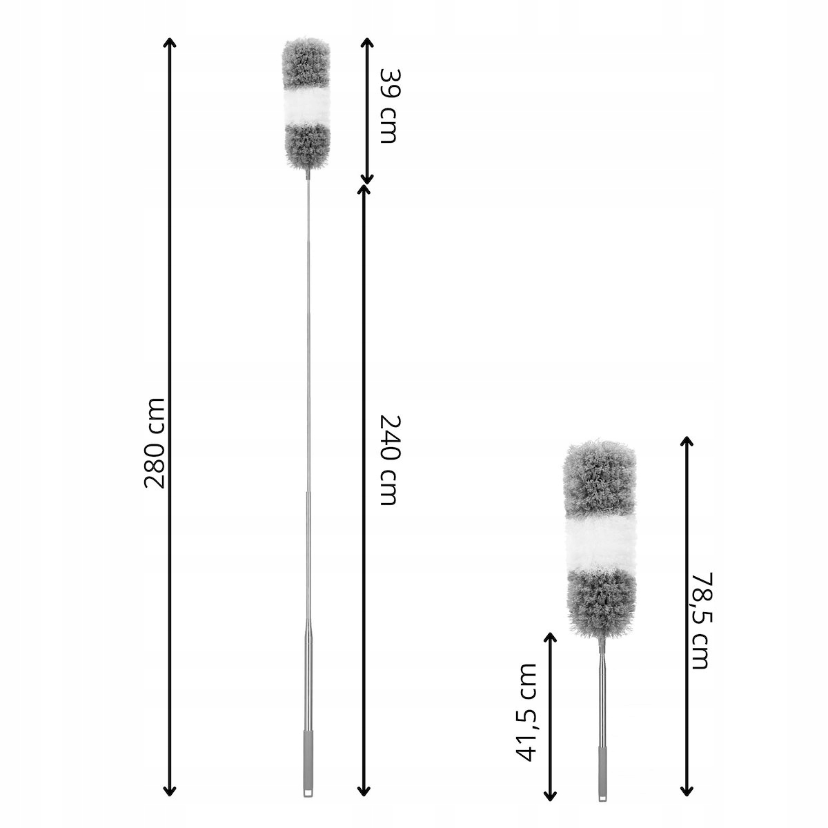 Наша метла — это не просто обычный инструмент для уборки пыли — благодаря телескопической ручке она может выдвигаться на длину до 280 см, поэтому вы легко сможете дотянуться до нее. даже в самые труднодоступные места, такие как верхние поверхности высокой мебели, углы комнат под потолком или люстры.