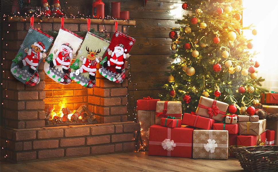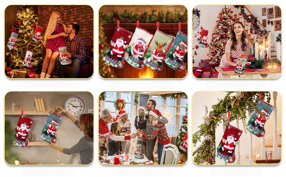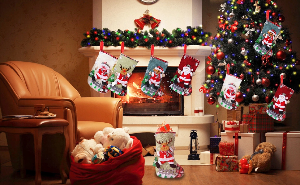 Украшения: Каждый чулок составляет около 31 см, шириной 19 см. Этот чулок имеет большую дыру наверху и просторный интерьер, который идеально подходит для всех видов сладостей, а также чулки для чулок для еще более захватывающего утра! Девочки и мальчики будут очень взволнованы.