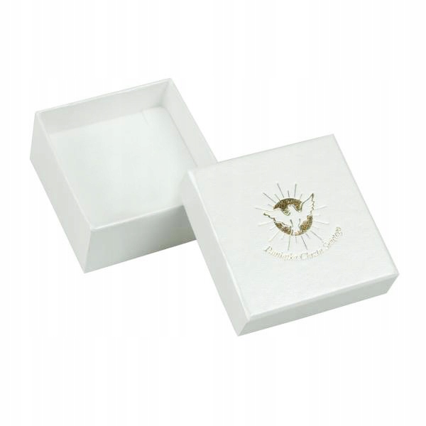 Экземплярная упаковка украшена золотым принтом с изображением голубя на фоне солнца и надписью «Сувенир Святого Крещения». Коробка обтянута белой бумагой с легким блеском и украшена нежной фактурой. Вставка изготовлена из губки и покрыта белым бархатом. Это создает единое целое, идеально подходящее для упаковки особенного подарка.