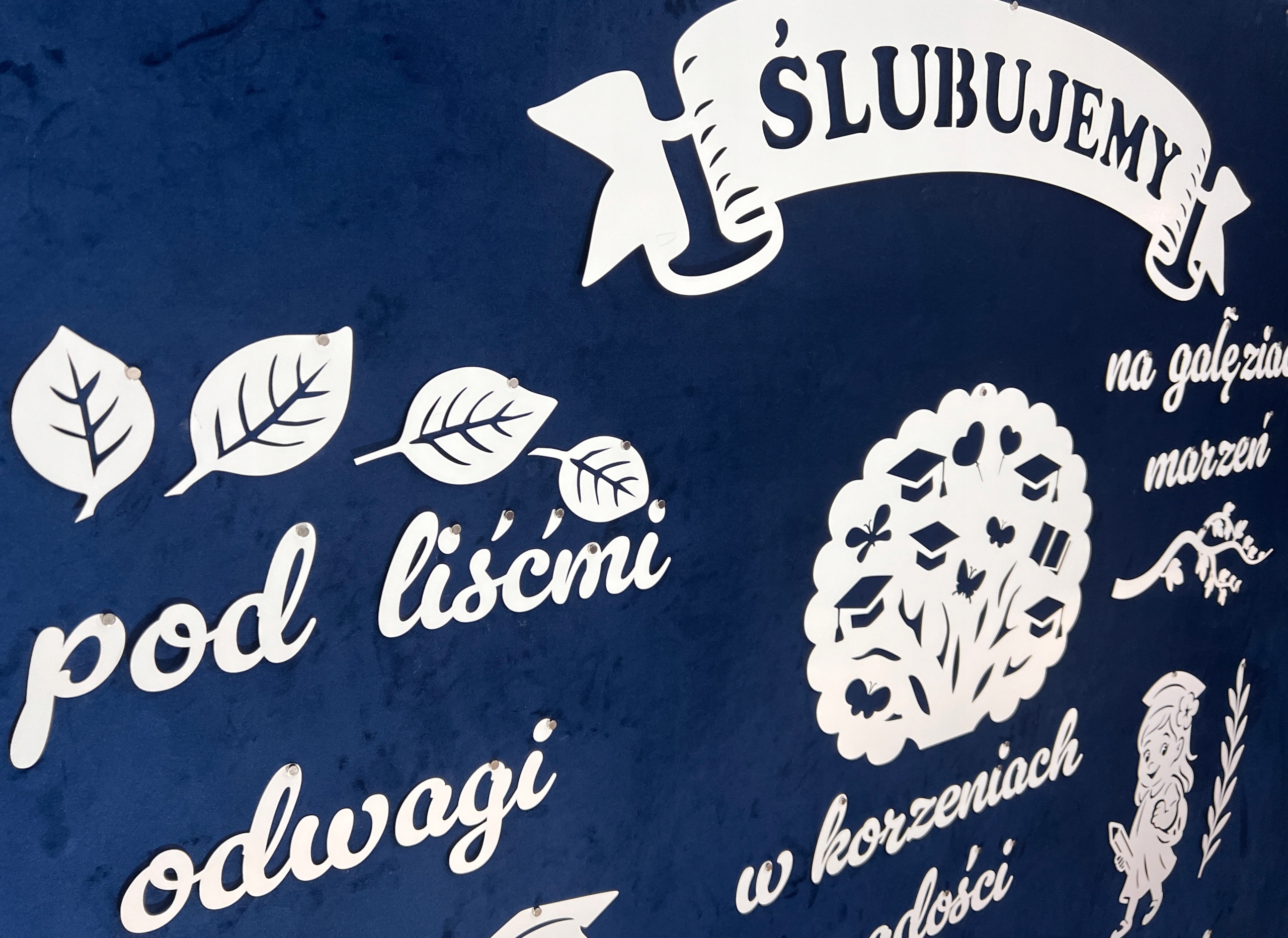 украшение - «Мы клянетесь - под листьями мужества, на ветвях мечты, в корнях радости - будь смелыми студентами» Студенческая церемония подгонки . Ее тема - Дерево как метафора развития - подчеркивает ценности, сопровождающие вход детей в школьный мир: мужество, мечты, радость и готовность учиться.