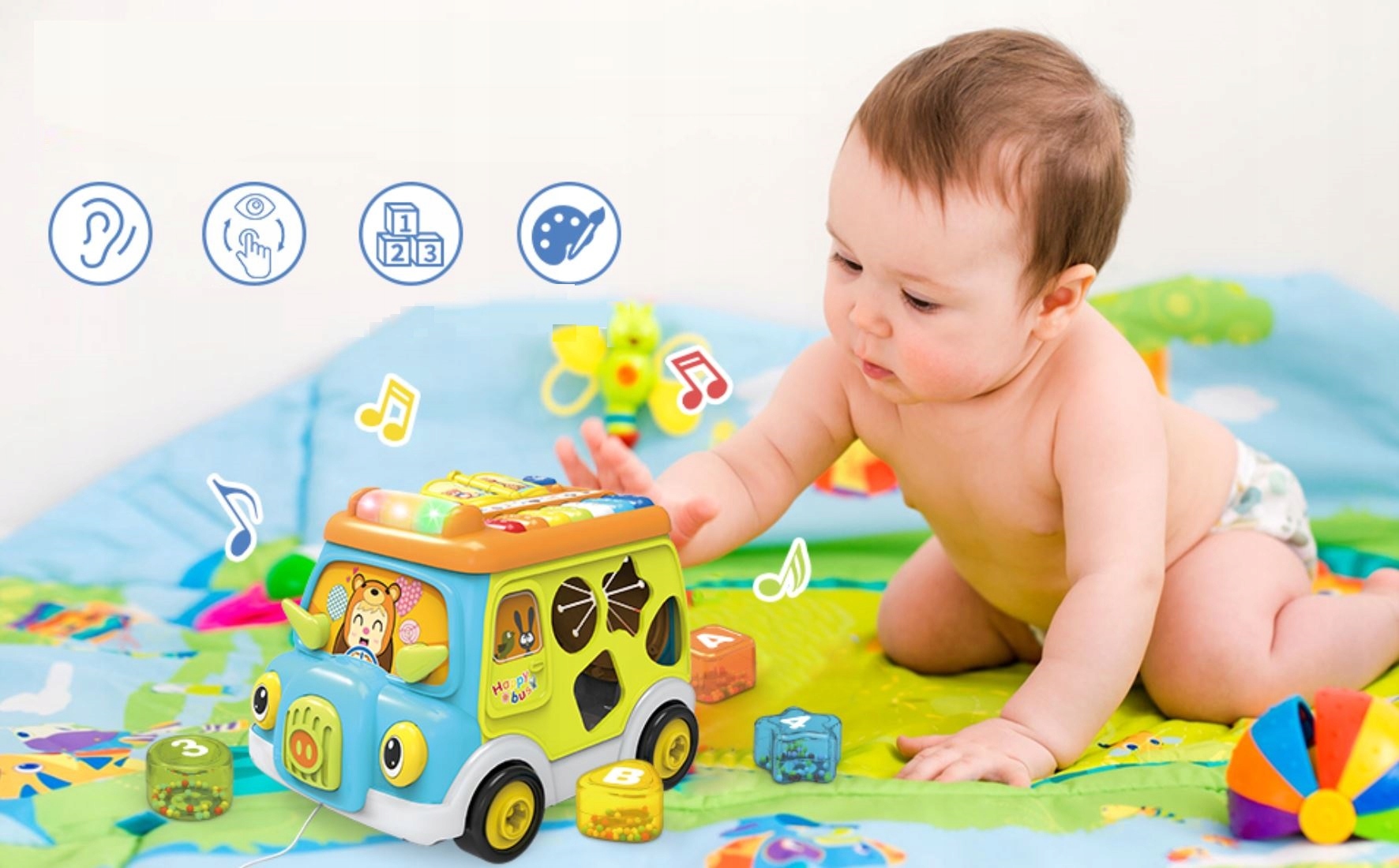 Благодаря отвертке ваш ребенок разовьет навыки ручного труда и открутит колеса на автобусе, превратится в маленькую мастером на все руки и на основе ассоциаций будет стимулировать его творческие способности. Сортировщик позволит вам сопоставлять отдельные фигуры с соответствующими отверстиями, влияя на творческие способности малыша, а заднее отверстие позволит вам самостоятельно вытащить все кубики, чтобы играть снова. Красочное пианино на крыше позволит вашему ребенку превратиться в маленького музыканта.