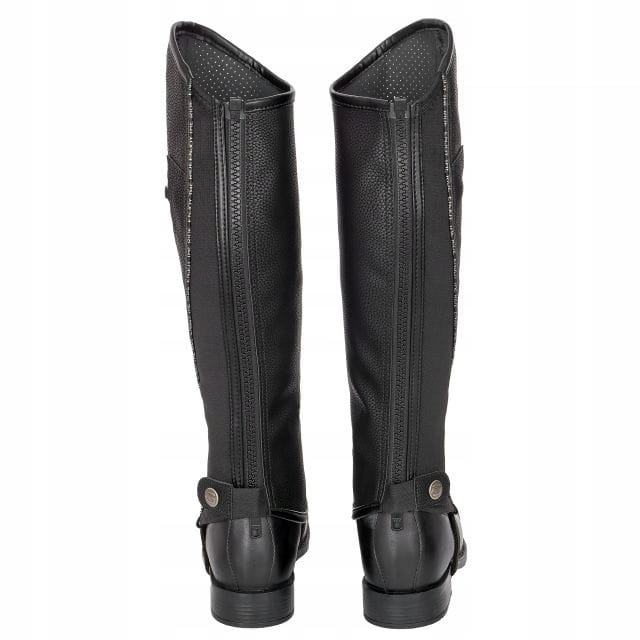 Элегантные шорты из качественного полиэстера. Швы выполнены таким образом, чтобы ребята хорошо прилегали и красиво смотрелись на икре. Имеют сзади прочную молнию, застегивающуюся сверху вниз, рядом с которой расположен эластичный материал, что делает чапсы более гибкими и удобными для надевания. Защелка, прикрепленная к эластичному материалу, защищает молнию от расстегивания. Изнутри они обшиты замшевым материалом, поэтому хорошо держат брюки и не смещаются. Ниже колена материал перфорирован, что увеличивает воздухопроницаемость. Небольшое пришивное украшение в виде серебряной фурнитуры делает чапсы уникальными и привлекательными.