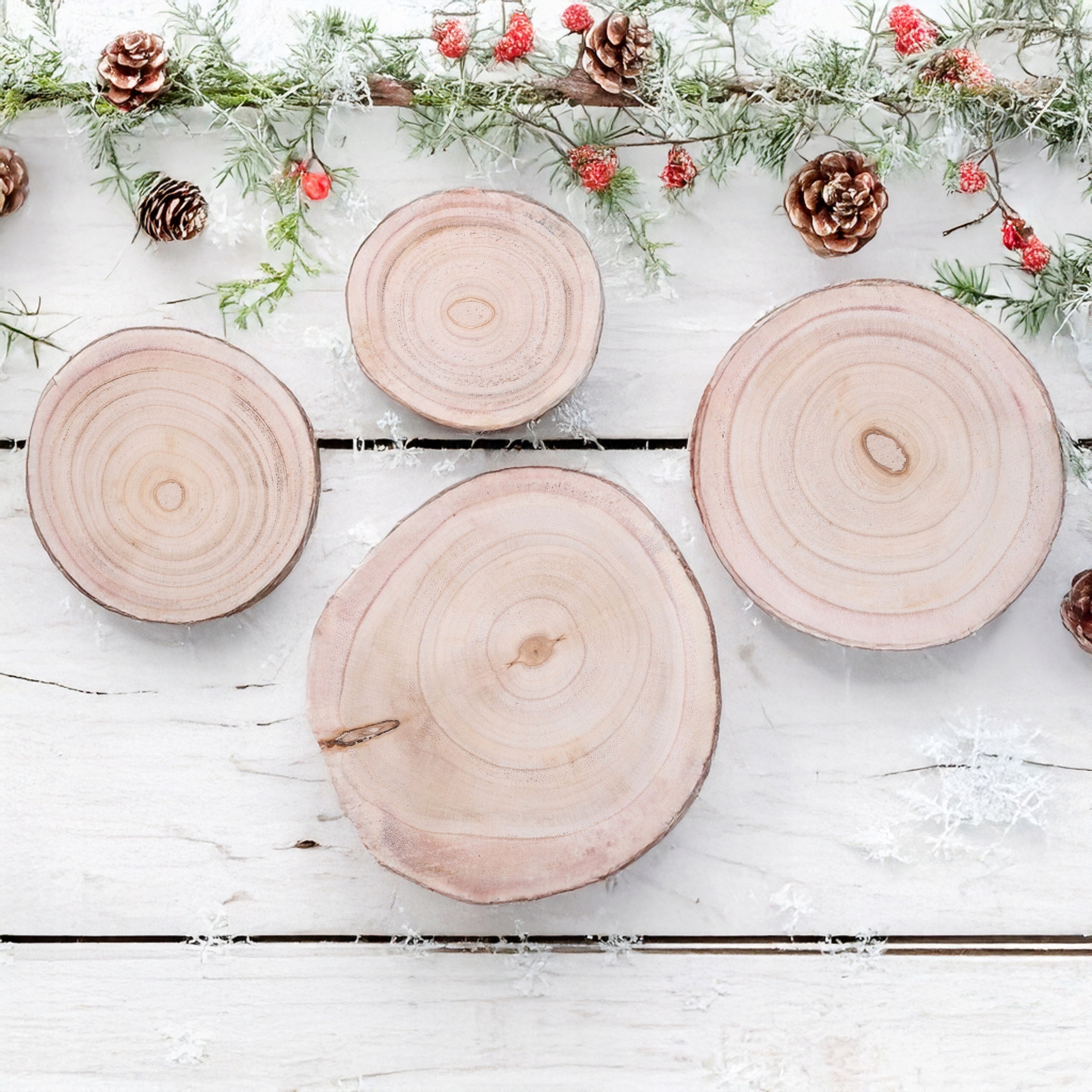 set естественные кусочки дерева Paulownia - идеальное украшение с деревенским характером. Он содержит четыре среза в разных размерах : диаметры 14 см, 16 см, 18 см и 20 смг, что делает его чрезвычайно универсальным. Естественный цвет и присутствие коры добавляют подлинность, а связывается с джут -, дает продукту эстетический вид и практическое применение