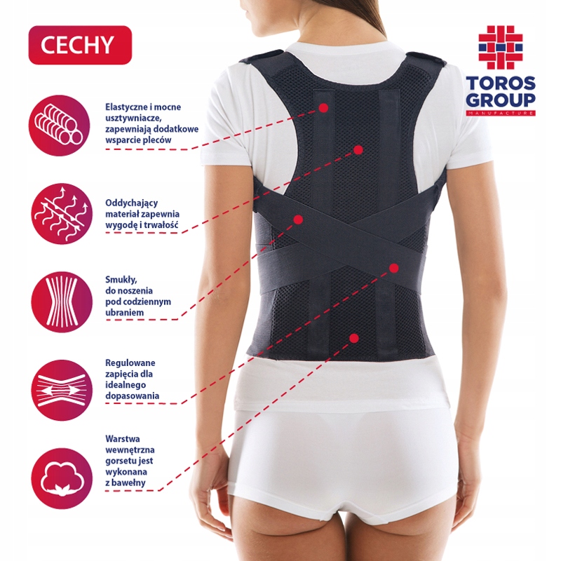 Корсет изготовлен из дышащего материала, что обеспечивает максимальный комфорт в использовании. За счет жесткости моделируемых ребер стабилизируется грудной и поясничный отделы позвоночника. Широкие лямки обеспечивают мягкое давление на плечи, а поясные лямки обеспечивают необходимый уровень сжатия и фиксации, тем самым уменьшая болезненные ощущения в верхнем и нижнем отделе позвоночника.