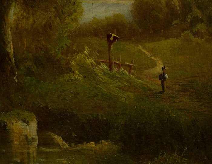 Старая картина маслом, написанная на панели, изображающая вид на берег реки.