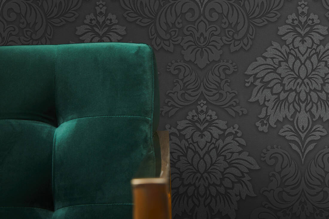 Современные обои с элегантным черным выпуклым орнаментом с блестящими элементами и ровным черным фоном. Подходит к любому интерьеру.