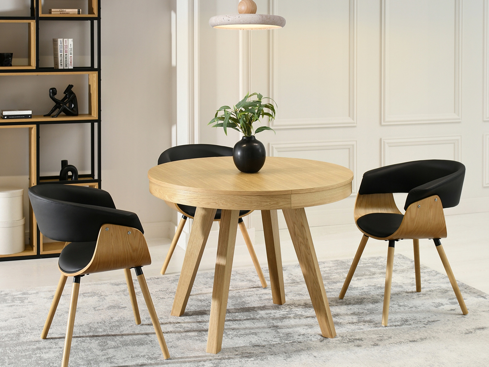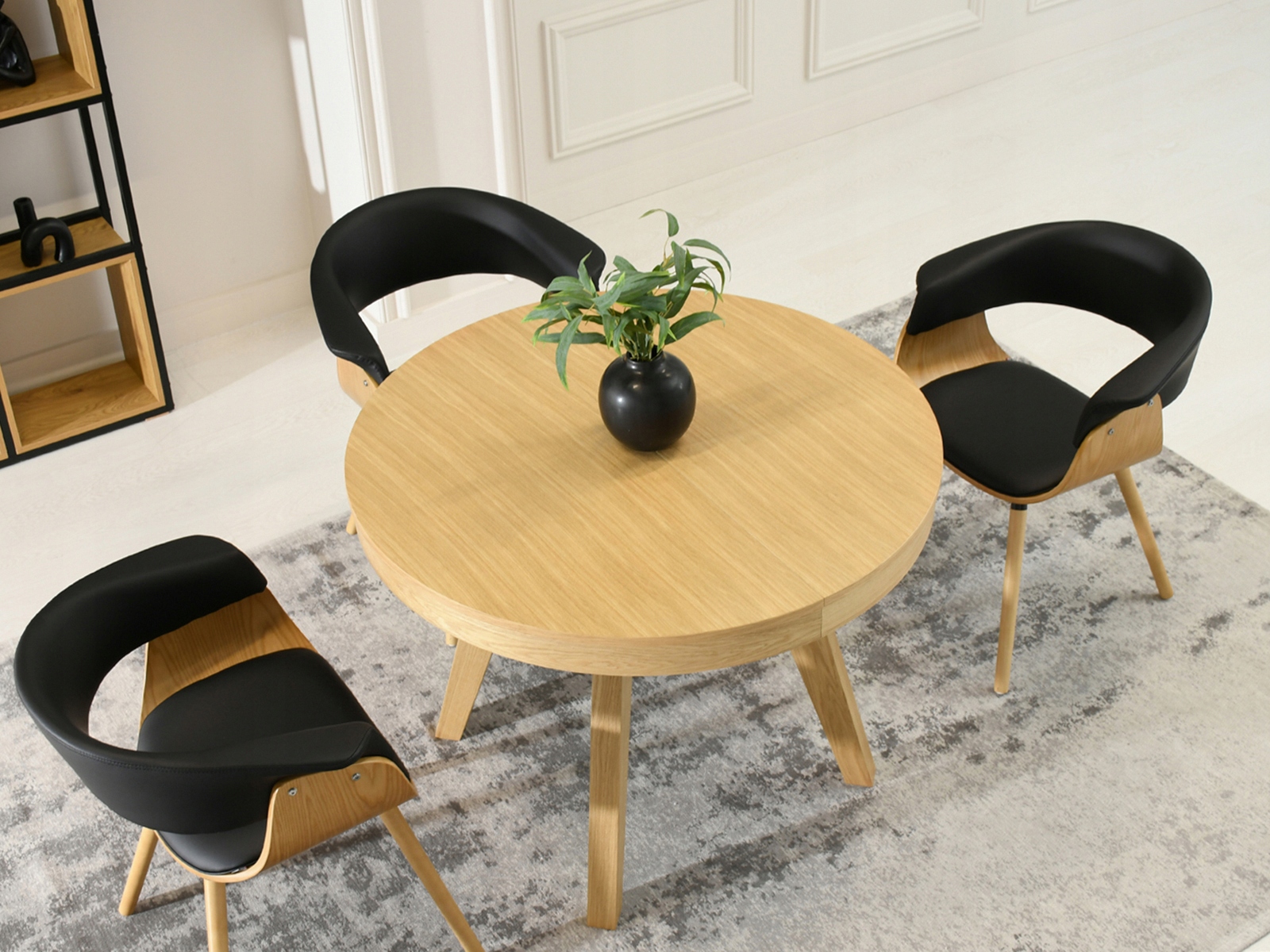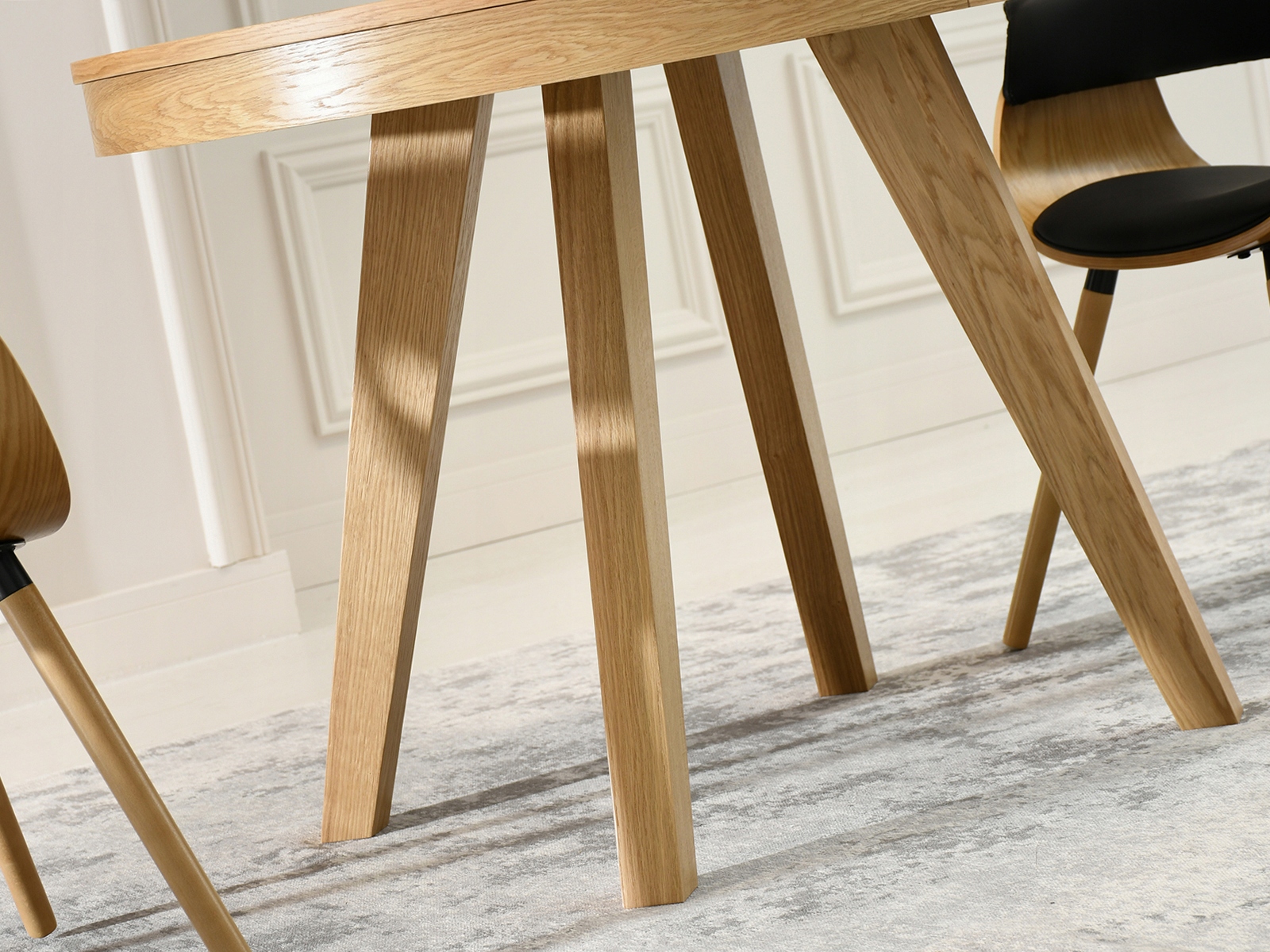 Tauri Table b> - отличное предложение для стильной гостиной или просторной кухни, где считаются как внешний вид, так и ежедневный комфорт. Круглая столешница способствует бесплатному разговору, создавая дружескую атмосферу с общей едой. Теплые цвета дерева привносят уюту в внутреннюю часть, гармонично гармонируя как с современным, так и с более традиционным декором. Сплошная конструкция и точная отделка обеспечивают долговечность и комфорт использования. Это предмет мебели, который легко станет центром домашней столовой или гостиной.