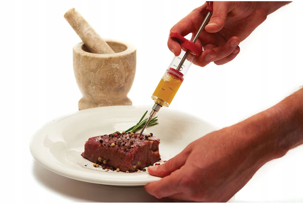 РЕКОМЕНДУЕТСЯ ДЛЯ ПРИГОТОВЛЕНИЯ МЯСНЫХ ИЗДЕЛИЙ - инжектор для мяса помогает готовить вкусные и хорошо приправленные мясные продукты. Он позволяет инжектировать мясо солевым рассолом, что ускоряет его просолку и делает его равномерным посолом, а также позволяет приправить мясо «изнутри».
