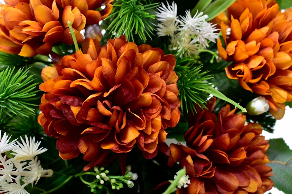 ✅ Украшение состоит из чудесных цветов хризантем и многочисленных зеленых и белых аксессуаров.
